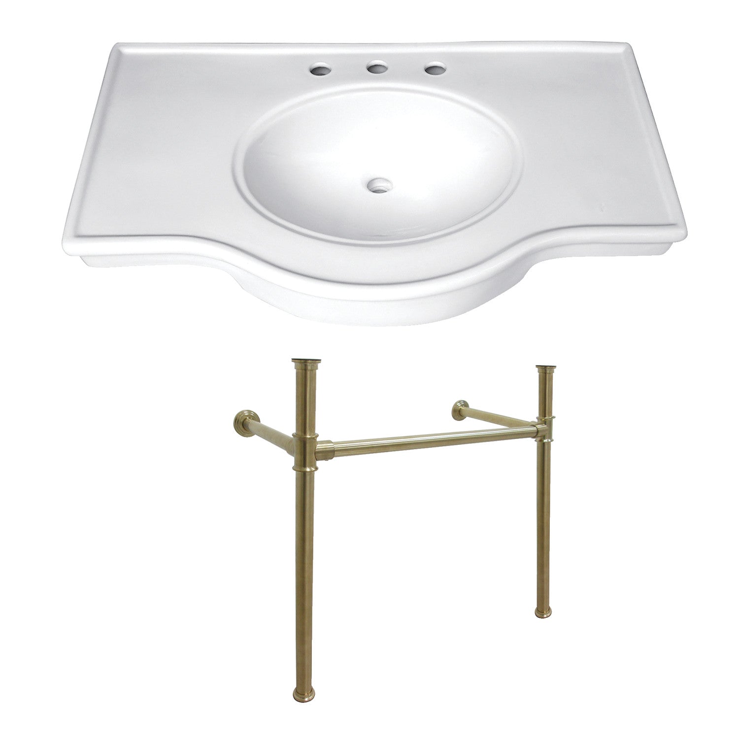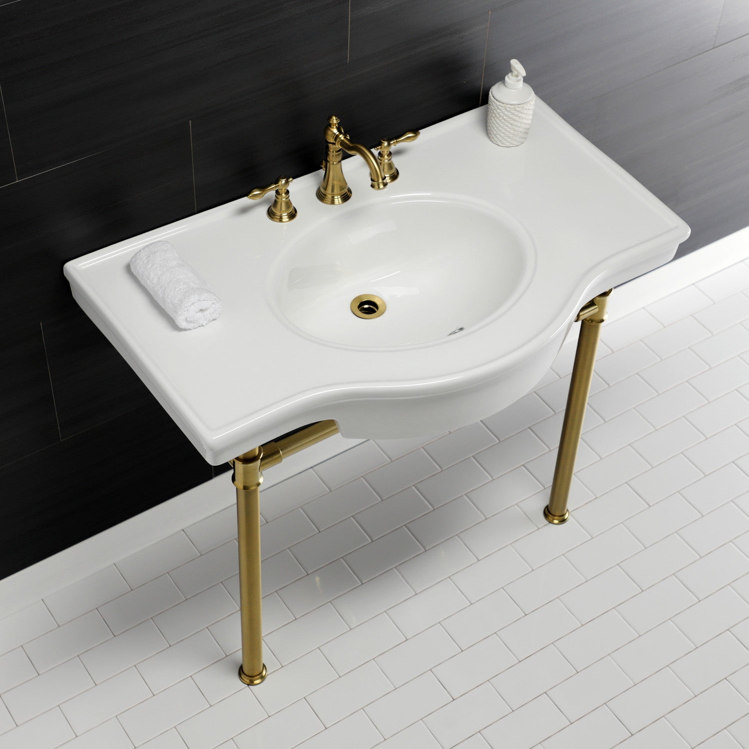With a beautiful ceramic counter top, this console sink set is a long lasting, durable, and elegant addition to your bathroom. A fabulous alternative where space is limited or tight, making them friendly for the whole family. The pristine, stain-resistant surface and glistening finish make for a very sturdy fixture that is easily maintained. Also for your convenience, anti-slip rubber pads are included with the stainless steel legs to ensure steadiness. Water supply kit, drain assembly, and the faucet are sold separately.