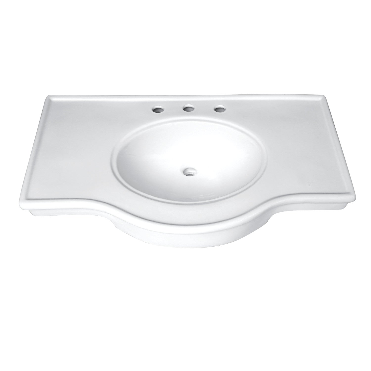 Kingston Brass' Templeton Collection is the perfect embodiment of the traditional portrait and contemporary technology with its extensive line of vanity consoles and bathroom fixtures. This console sink top in particular features overall dimensions of (L)37-3/8" x (W)21-5/8" x (H)8-7/8" with pre-drilled 3-hole for faucet installation. Built from a stunning ceramic for long-lasting durability, the Templeton ceramic console sink basin offers elegant and transitional stylings. Also for your convenience, an oval ceramic undermount sink is attached to the ceramic countertop. Its pristine, stain-resistant surface and glistening finish make for a very sturdy fixture that is easily maintained. Pair this console top with console legs, available in a variety of finishes.