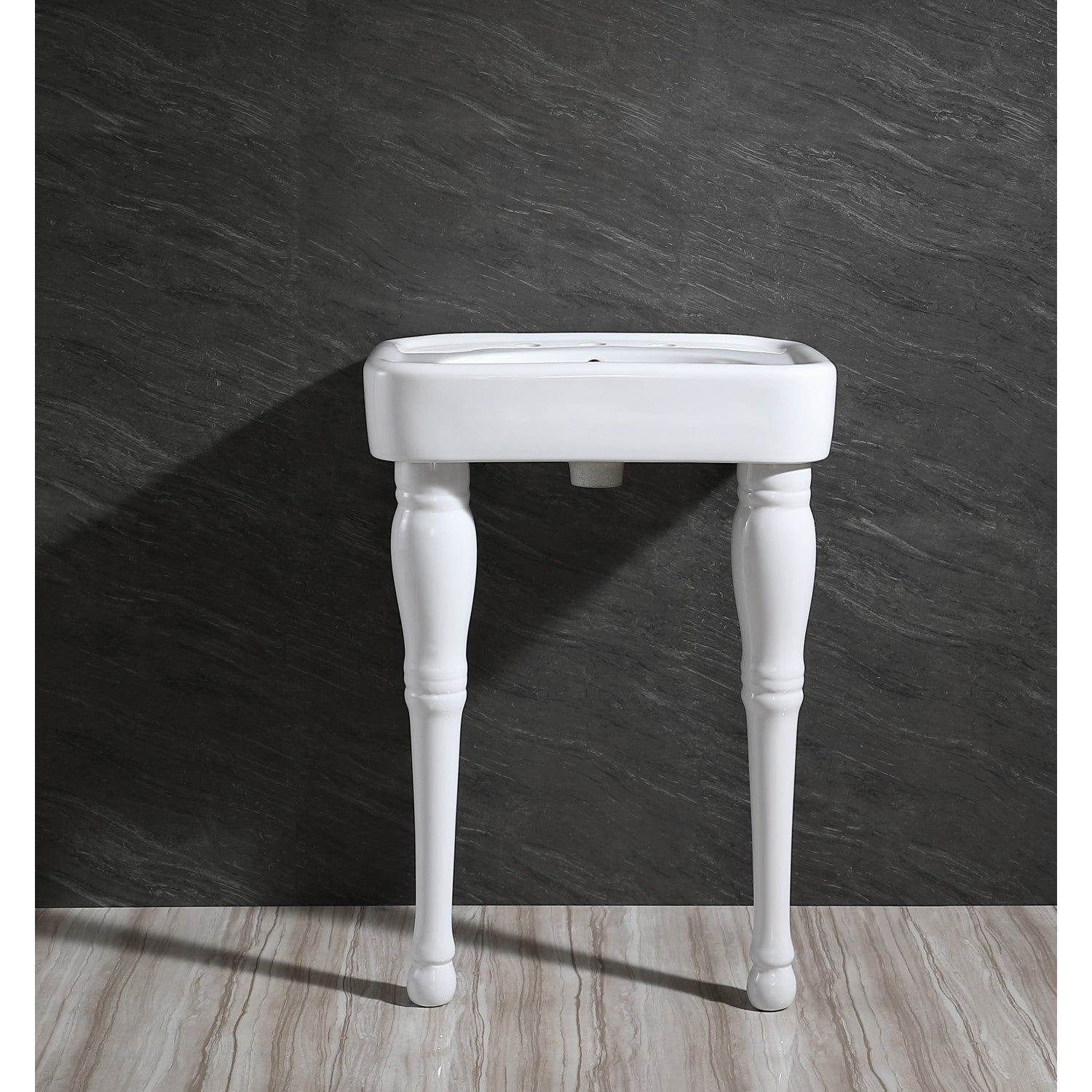Built from a stunning porcelain for long-lasting durability, the Robert 26-inch ceramic console sink top offers elegant and transitional stylings. The pristine, stain-resistant surface and glistening finish make for a very sturdy fixture that is easily maintained. This console top in particular features dimensions of 25-9/16" (L) x 19-5/16" (W) x 7-7/8" (H). Pair this top with console legs or pedestal.