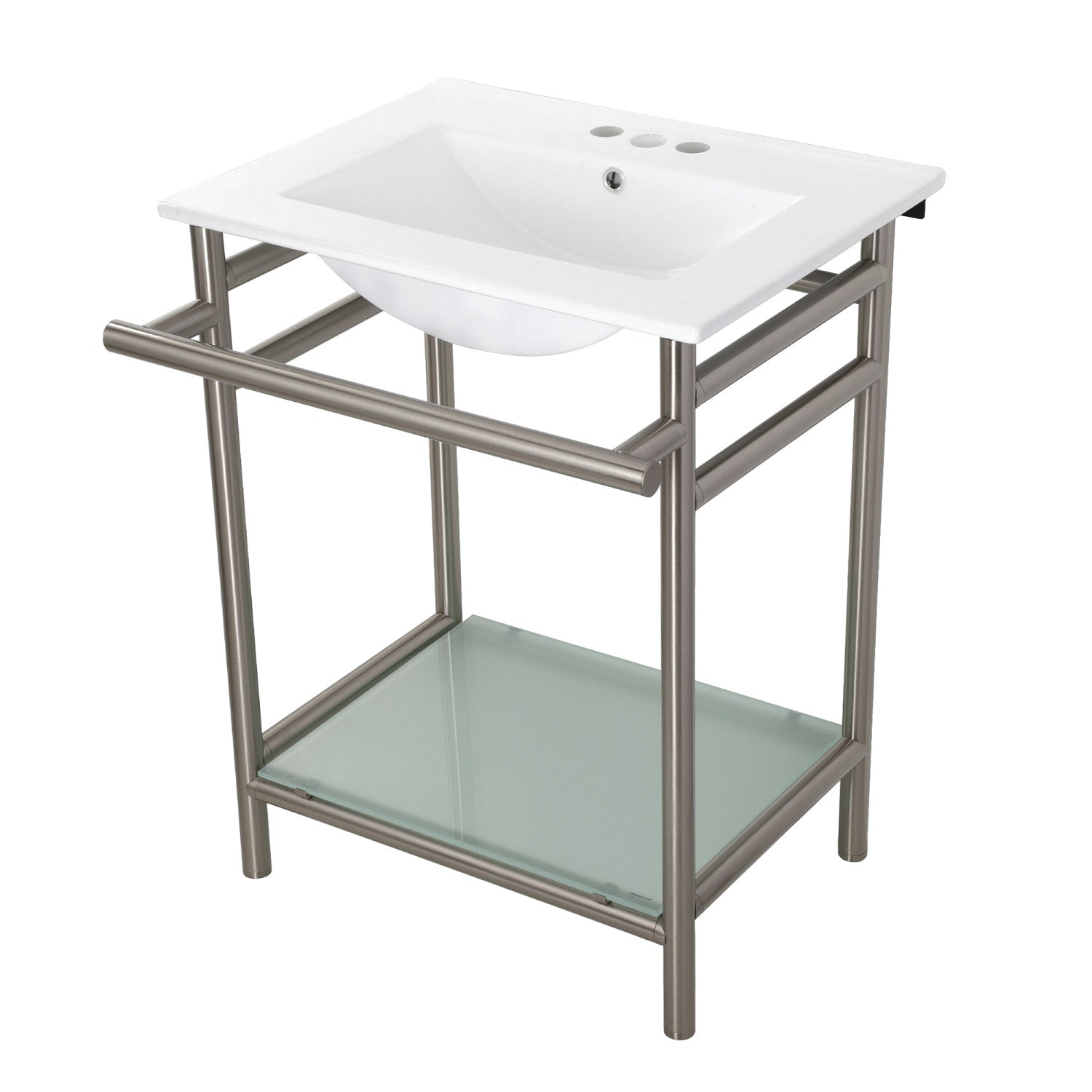 With a beautiful ceramic counter top, this console sink set is a long lasting, durable, and elegant addition to your bathroom. Solid ceramic sinks and tops like the LBT-series top in this listing are finished with a glossy glaze on the top and sink basin interior, making for a pristine, stain-resistant surface and glistening finish that is easily maintained. The underside and basin exterior are unglazed/unfinished and coated with a matte white protective sealant that prevents moisture absorption and staining. Solid ceramic pieces cannot be glazed on all sides, because the nature of ceramic material requires a minimum surface area be left raw during the glaze firing process so the piece does not explode. Also for your convenience, anti-slip rubber pads are included with the stainless steel legs to ensure steadiness. Additionally, this console sink includes tempered glass storage shelf and 24" front towel bar. Water supply kit, drain assembly, and the faucet are sold separately.