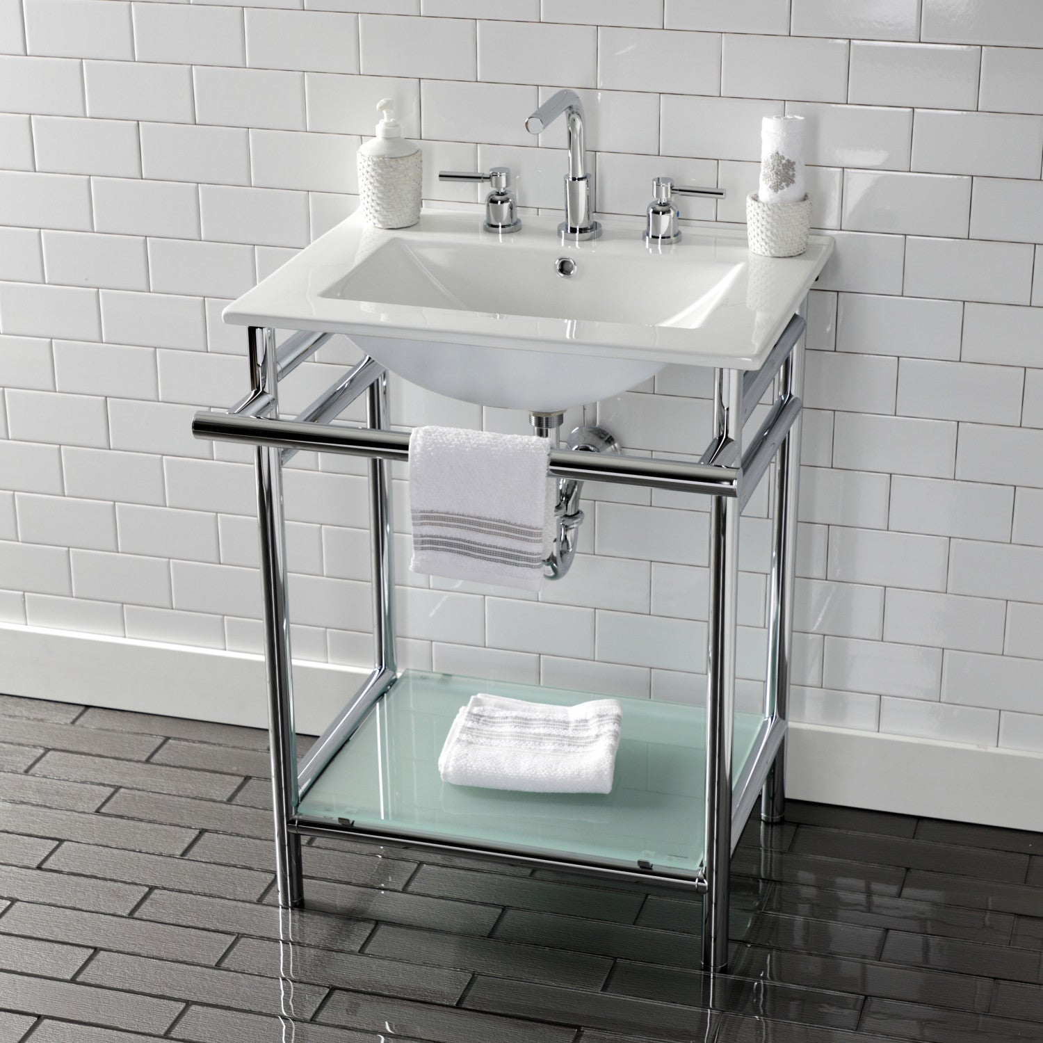 With a beautiful ceramic counter top, this console sink set is a long lasting, durable, and elegant addition to your bathroom. Solid ceramic sinks and tops like the LBT-series top in this listing are finished with a glossy glaze on the top and sink basin interior, making for a pristine, stain-resistant surface and glistening finish that is easily maintained. The underside and basin exterior are unglazed/unfinished and coated with a matte white protective sealant that prevents moisture absorption and staining. Solid ceramic pieces cannot be glazed on all sides, because the nature of ceramic material requires a minimum surface area be left raw during the glaze firing process so the piece does not explode. Also for your convenience, anti-slip rubber pads are included with the stainless steel legs to ensure steadiness. Additionally, this console sink includes tempered glass storage shelf and 24" front towel bar. Water supply kit, drain assembly, and the faucet are sold separately.