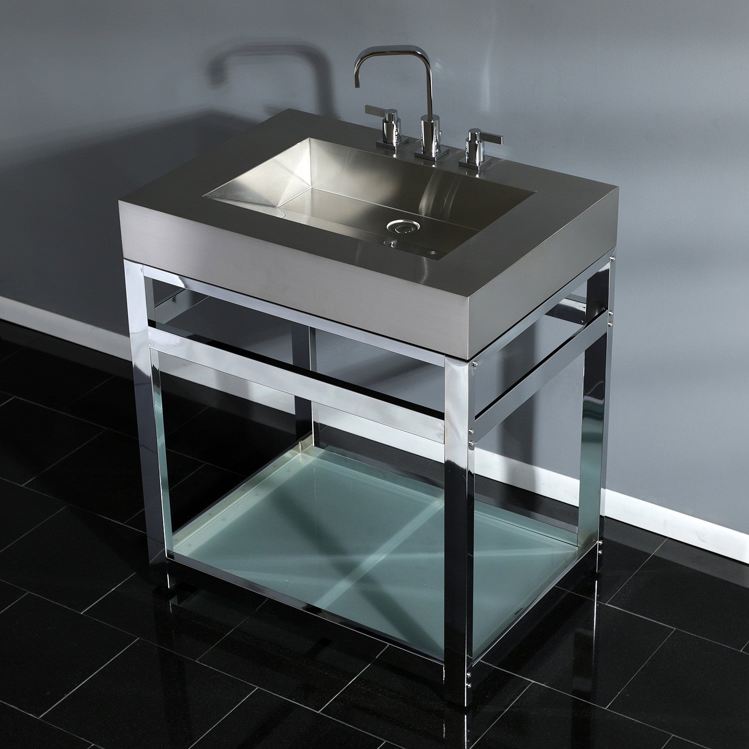 The Kingston Commercial collection brings forth bold design and smooth lines, enhancing your contemporarily styled home. A simple minimalist support for your console vanity sink tops, this sink base comes in a multitude of finishes that will bring out the shine in your bathroom. Additionally, the included tempered glass shelf adds functionality and aesthetic appeal. These console vanity bases will stylishly and effortlessly become a part of your home, completing your bathroom ensemble.