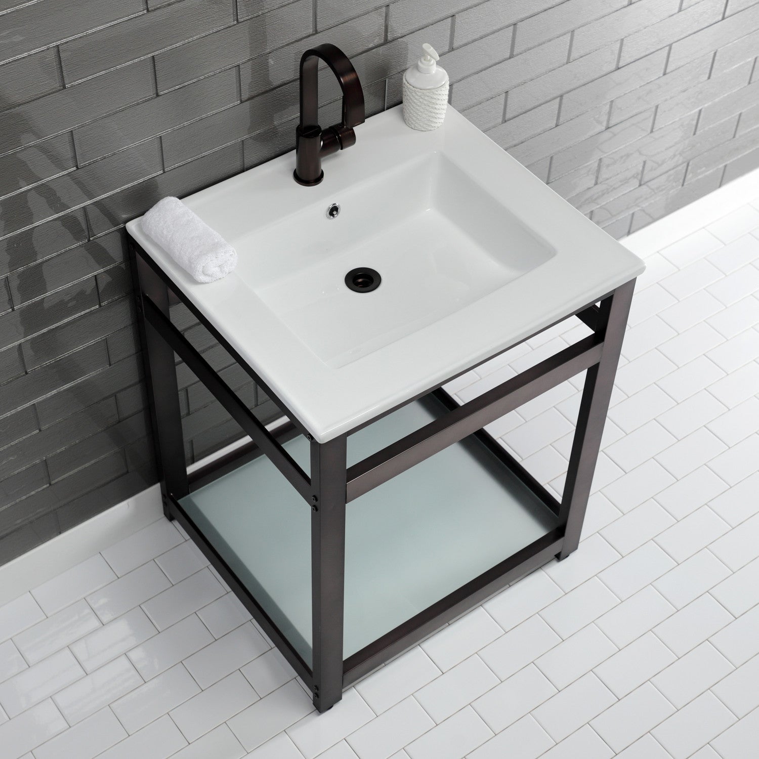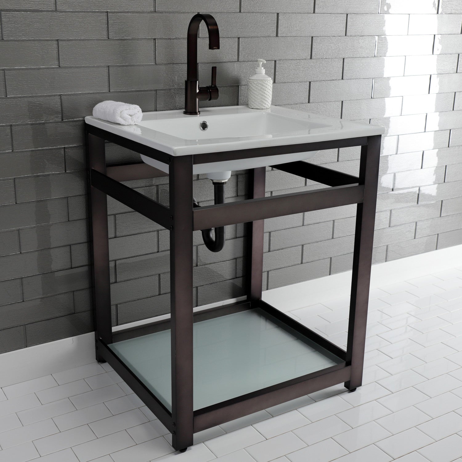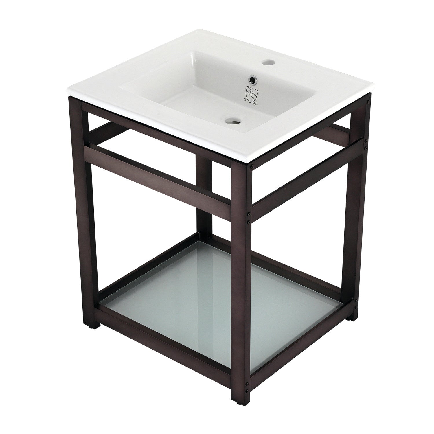 - Includes steel console sink base and tempered glass shelf