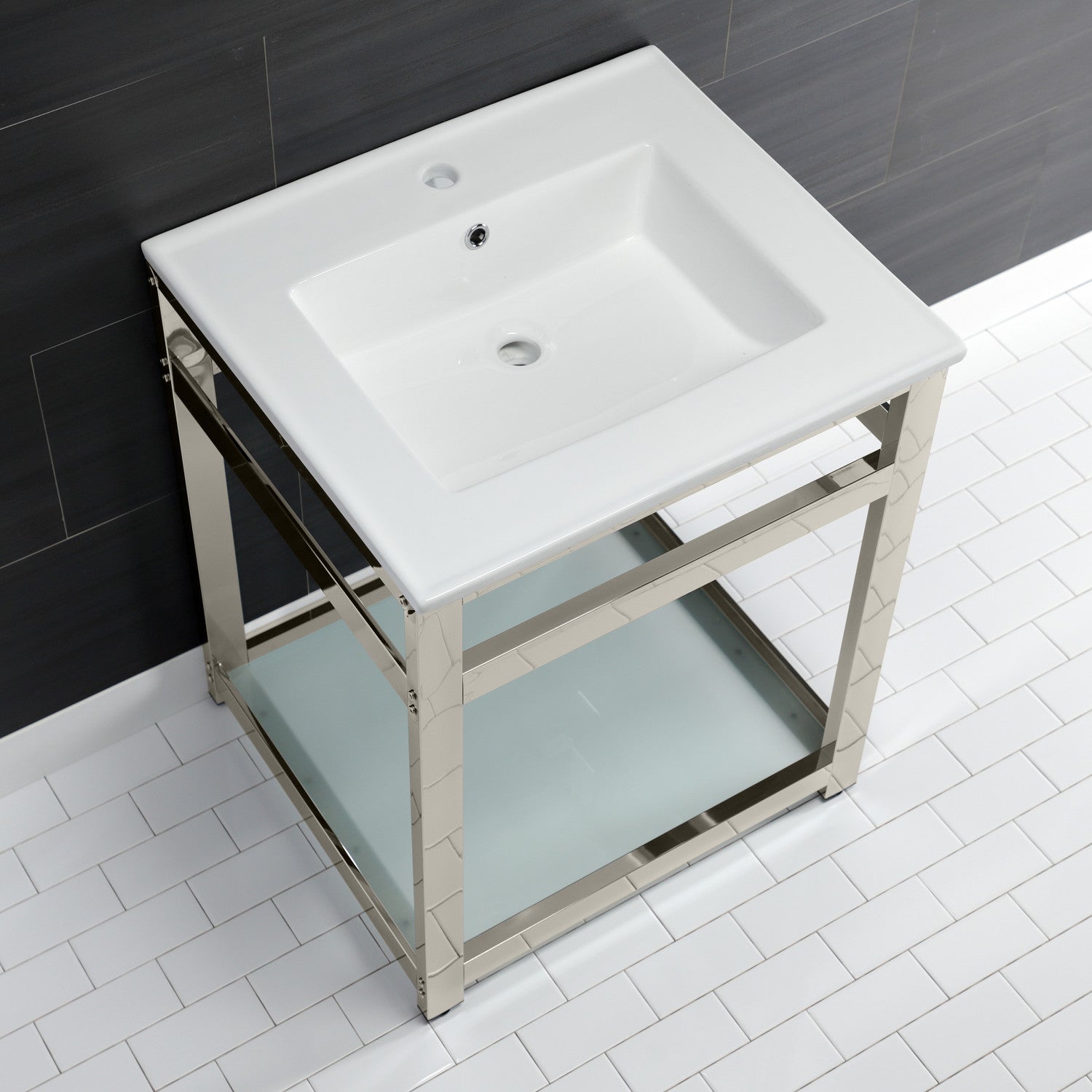 Exquisitely styled for your contemporary taste, this console sink will enhance your bathroom living space. With a beautiful ceramic counter top, this console sink set is a long lasting, durable, and elegant addition to your bathroom. The Kingston Brass 25-inch ceramic console sink (1-hole) features a wash basin and steel base that is available in a handful of finish options. Solid ceramic sinks and tops like the LBT-series top in this listing are finished with a glossy glaze on the top and sink basin interior, making for a pristine, stain-resistant surface and glistening finish that is easily maintained. The underside and basin exterior are unglazed/unfinished and coated with a matte white protective sealant that prevents moisture absorption and staining. Solid ceramic pieces cannot be glazed on all sides, because the nature of ceramic material requires a minimum surface area be left raw during the glaze firing process so the piece does not explode. Water supply kit, drain assembly, and the faucet are sold separately.