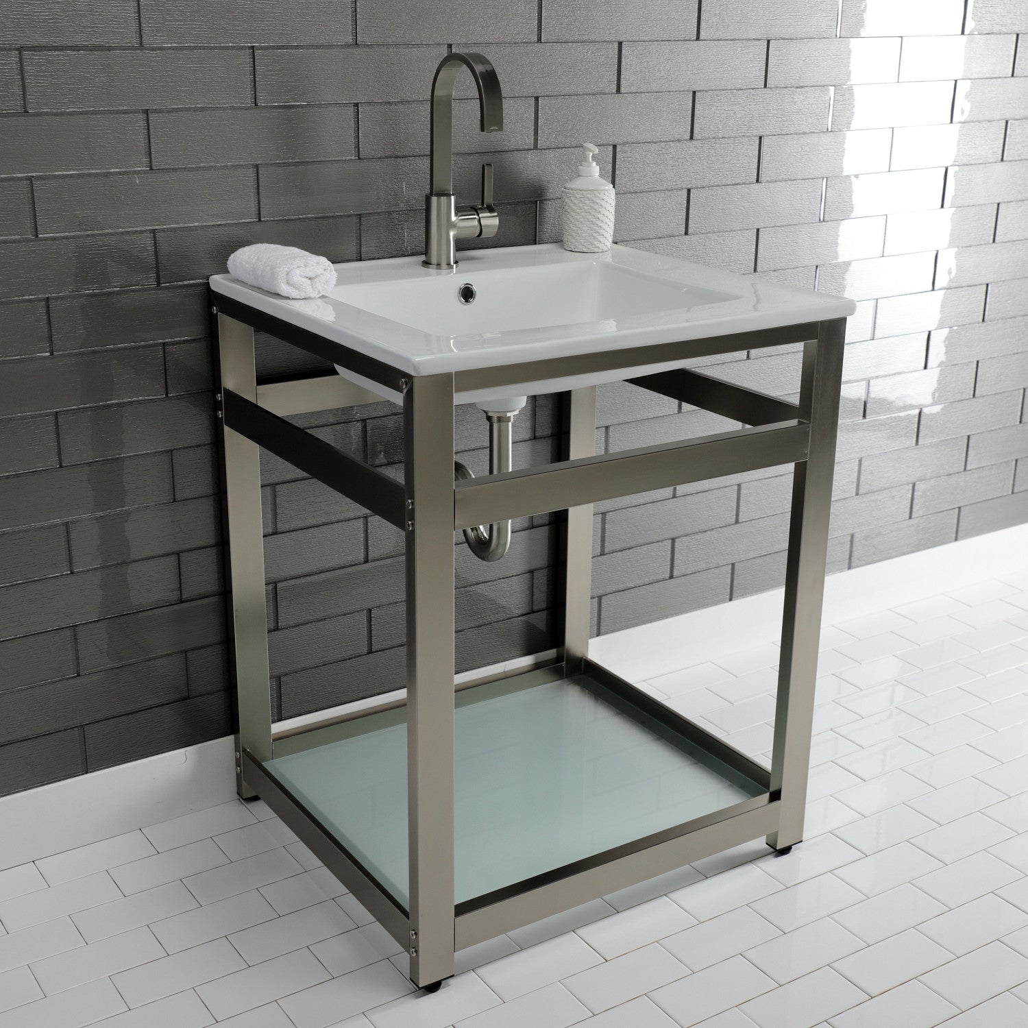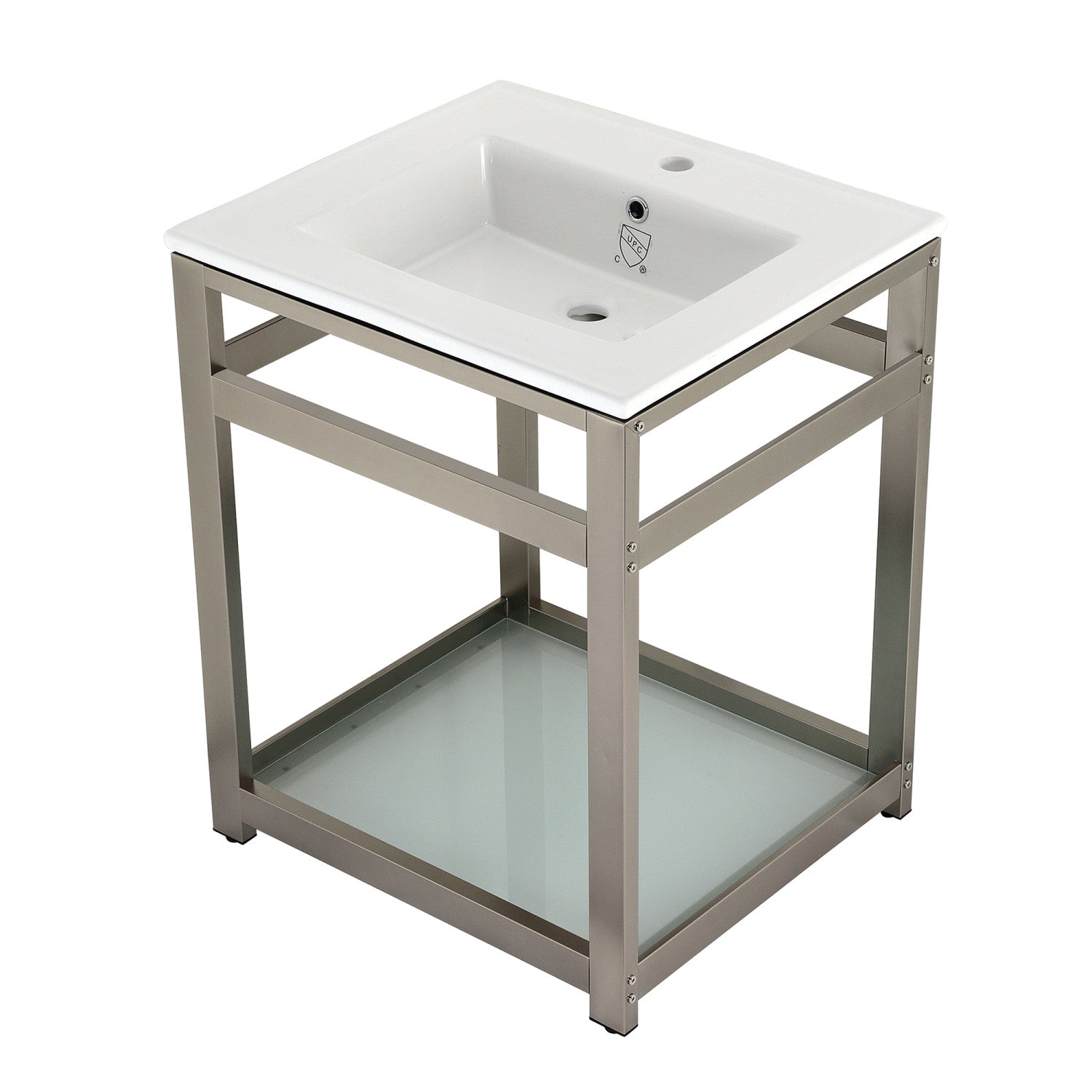 Exquisitely styled for your contemporary taste, this console sink will enhance your bathroom living space. With a beautiful ceramic counter top, this console sink set is a long lasting, durable, and elegant addition to your bathroom. The Kingston Brass 25-inch ceramic console sink (1-hole) features a wash basin and steel base that is available in a handful of finish options. Solid ceramic sinks and tops like the LBT-series top in this listing are finished with a glossy glaze on the top and sink basin interior, making for a pristine, stain-resistant surface and glistening finish that is easily maintained. The underside and basin exterior are unglazed/unfinished and coated with a matte white protective sealant that prevents moisture absorption and staining. Solid ceramic pieces cannot be glazed on all sides, because the nature of ceramic material requires a minimum surface area be left raw during the glaze firing process so the piece does not explode. Water supply kit, drain assembly, and the faucet are sold separately.