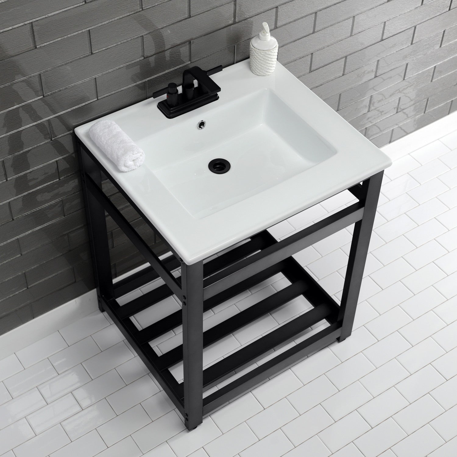 Exquisitely styled for your contemporary taste, this console sink will enhance your bathroom living space. With a beautiful ceramic counter top, this console sink set is a long lasting, durable, and elegant addition to your bathroom. The Kingston Brass 25-inch ceramic console sink (4-inch, 3-hole) features a wash basin and steel base that is available in a handful of finish options. Solid ceramic sinks and tops like the LBT-series top in this listing are finished with a glossy glaze on the top and sink basin interior, making for a pristine, stain-resistant surface and glistening finish that is easily maintained. The underside and basin exterior are unglazed/unfinished and coated with a matte white protective sealant that prevents moisture absorption and staining. Solid ceramic pieces cannot be glazed on all sides, because the nature of ceramic material requires a minimum surface area be left raw during the glaze firing process so the piece does not explode. Water supply kit, drain assembly, and the faucet are sold separately.