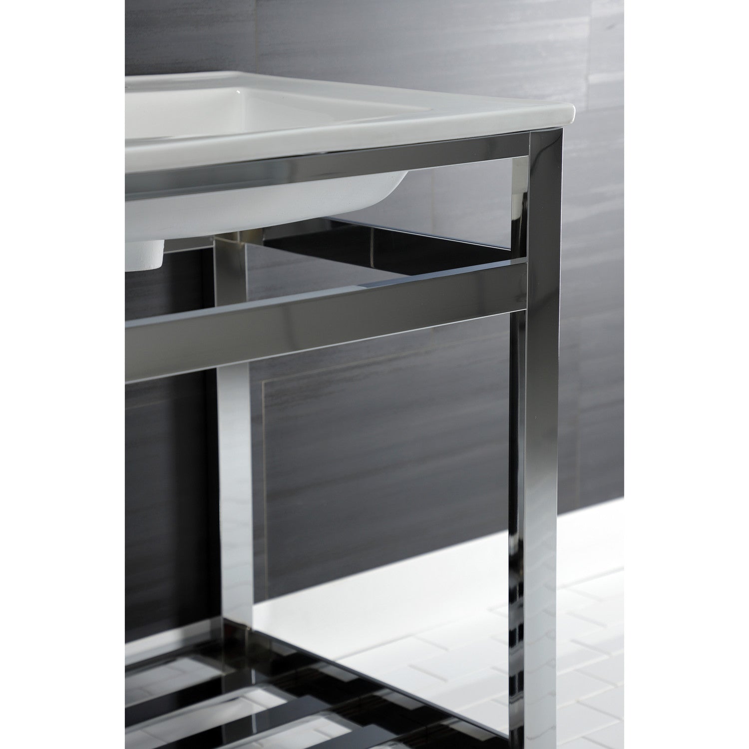 Exquisitely styled for your contemporary taste, this console sink will enhance your bathroom living space. With a beautiful ceramic counter top, this console sink set is a long lasting, durable, and elegant addition to your bathroom. The Kingston Brass 25-inch ceramic console sink (4-inch, 3-hole) features a wash basin and steel base that is available in a handful of finish options. Solid ceramic sinks and tops like the LBT-series top in this listing are finished with a glossy glaze on the top and sink basin interior, making for a pristine, stain-resistant surface and glistening finish that is easily maintained. The underside and basin exterior are unglazed/unfinished and coated with a matte white protective sealant that prevents moisture absorption and staining. Solid ceramic pieces cannot be glazed on all sides, because the nature of ceramic material requires a minimum surface area be left raw during the glaze firing process so the piece does not explode. Water supply kit, drain assembly, and the faucet are sold separately.