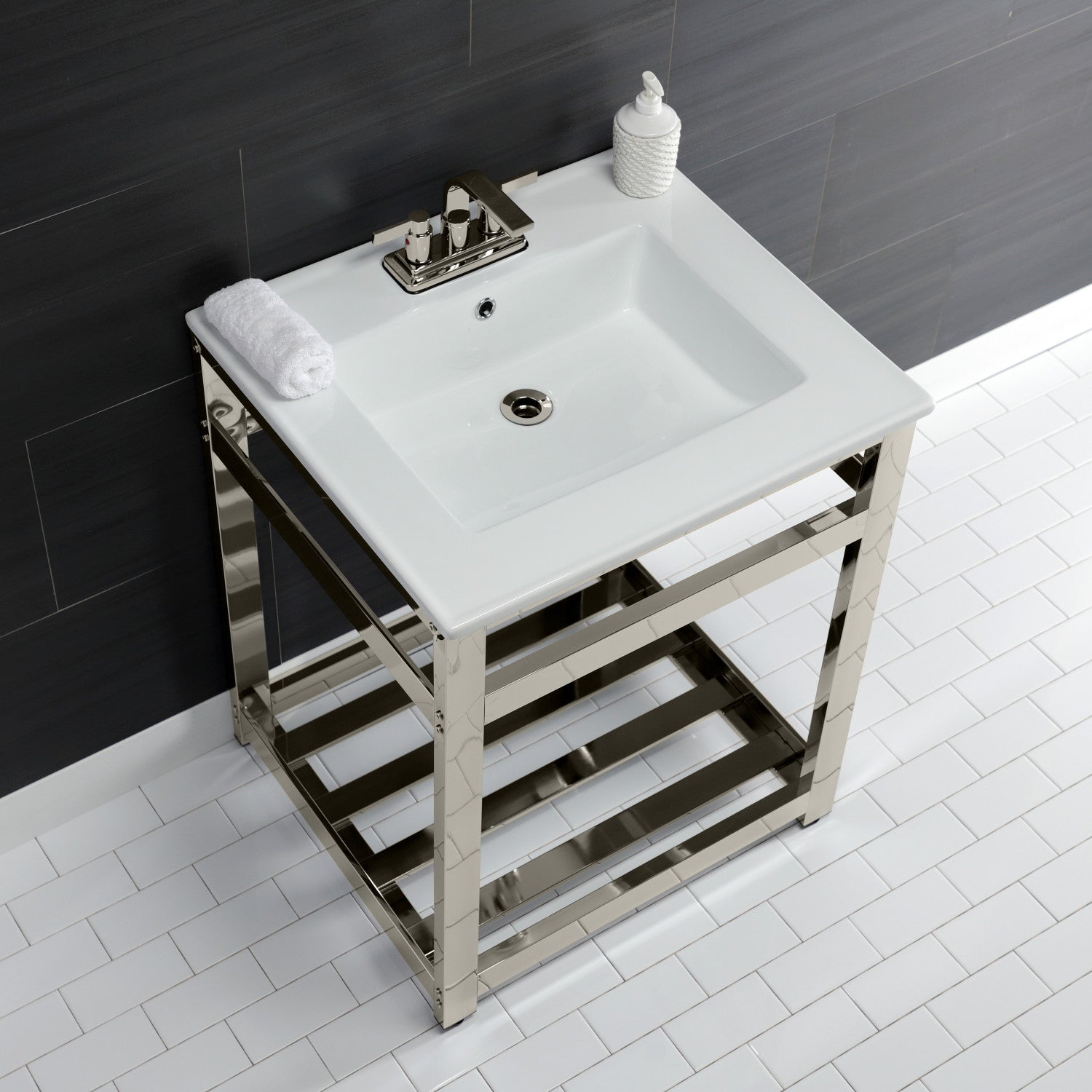 Exquisitely styled for your contemporary taste, this console sink will enhance your bathroom living space. With a beautiful ceramic counter top, this console sink set is a long lasting, durable, and elegant addition to your bathroom. The Kingston Brass 25-inch ceramic console sink (4-inch, 3-hole) features a wash basin and steel base that is available in a handful of finish options. Solid ceramic sinks and tops like the LBT-series top in this listing are finished with a glossy glaze on the top and sink basin interior, making for a pristine, stain-resistant surface and glistening finish that is easily maintained. The underside and basin exterior are unglazed/unfinished and coated with a matte white protective sealant that prevents moisture absorption and staining. Solid ceramic pieces cannot be glazed on all sides, because the nature of ceramic material requires a minimum surface area be left raw during the glaze firing process so the piece does not explode. Water supply kit, drain assembly, and the faucet are sold separately.