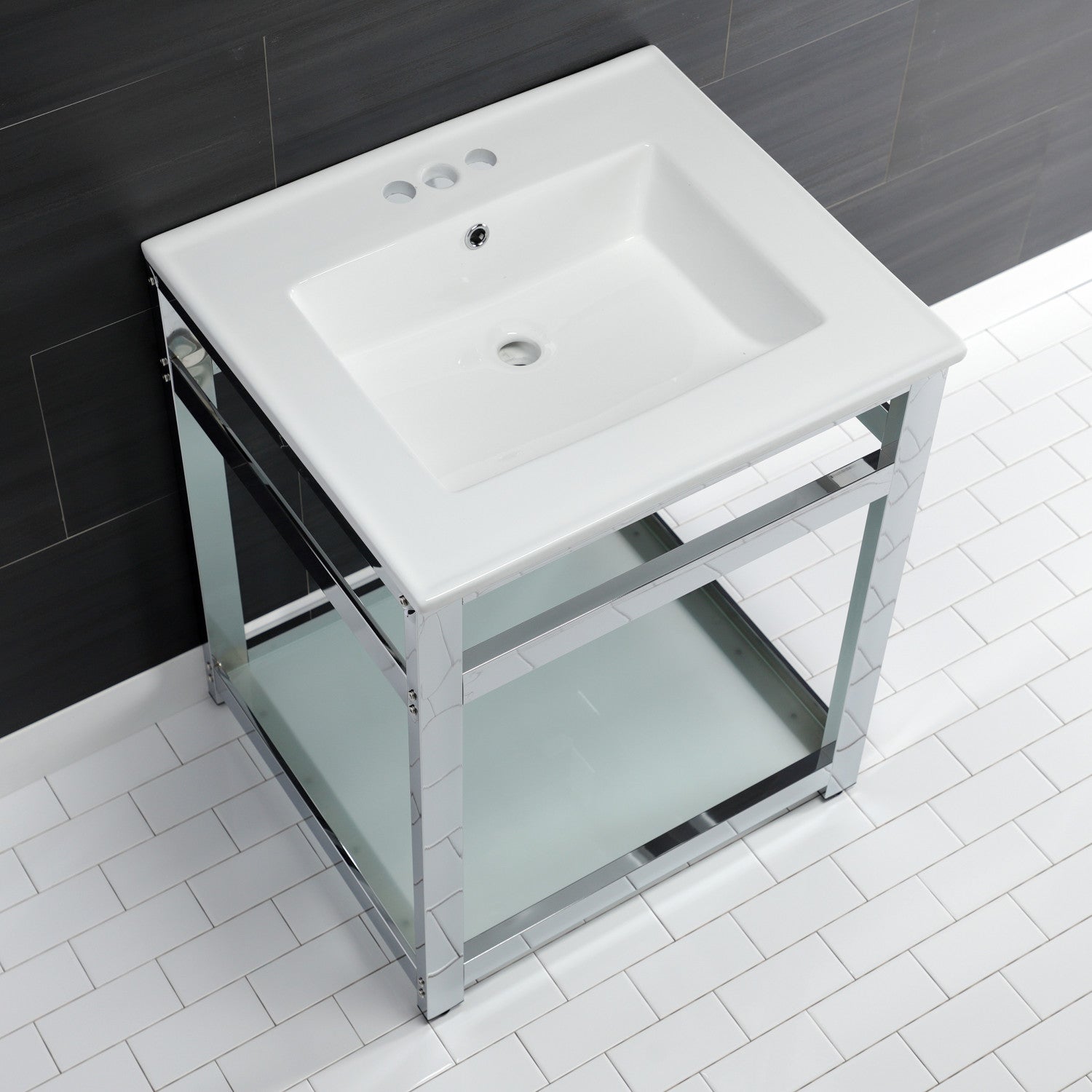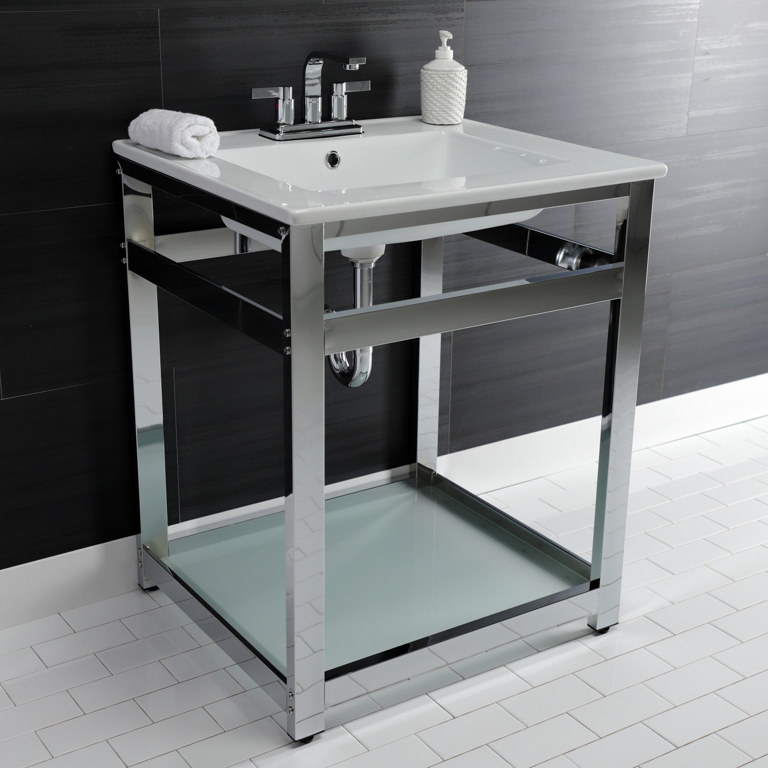Exquisitely styled for your contemporary taste, this console sink will enhance your bathroom living space. With a beautiful ceramic counter top, this console sink set is a long lasting, durable, and elegant addition to your bathroom. The Kingston Brass 25-inch ceramic console sink (4-inch, 3-hole) features a wash basin and steel base that is available in a handful of finish options. Solid ceramic sinks and tops like the LBT-series top in this listing are finished with a glossy glaze on the top and sink basin interior, making for a pristine, stain-resistant surface and glistening finish that is easily maintained. The underside and basin exterior are unglazed/unfinished and coated with a matte white protective sealant that prevents moisture absorption and staining. Solid ceramic pieces cannot be glazed on all sides, because the nature of ceramic material requires a minimum surface area be left raw during the glaze firing process so the piece does not explode. Water supply kit, drain assembly, and the faucet are sold separately.