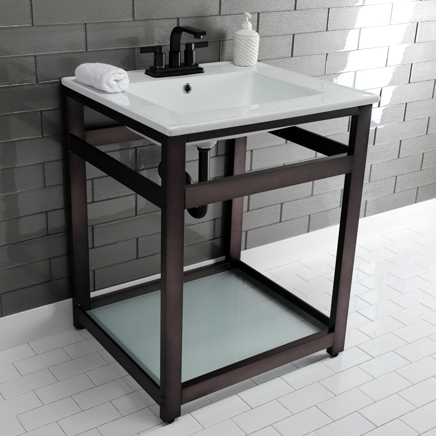 - Includes steel console sink base and tempered glass shelf