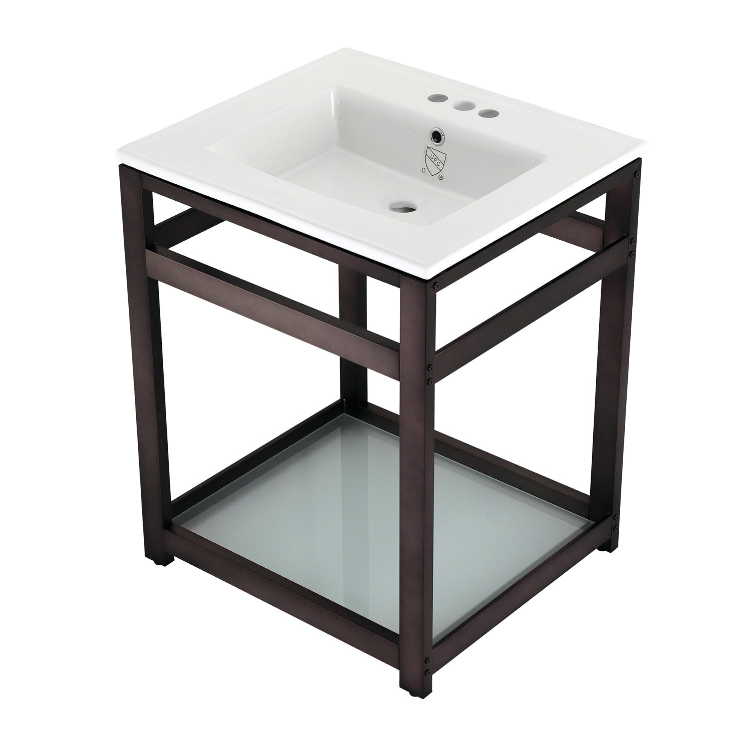 Exquisitely styled for your contemporary taste, this console sink will enhance your bathroom living space. With a beautiful ceramic counter top, this console sink set is a long lasting, durable, and elegant addition to your bathroom. The Kingston Brass 25-inch ceramic console sink (4-inch, 3-hole) features a wash basin and steel base that is available in a handful of finish options. Solid ceramic sinks and tops like the LBT-series top in this listing are finished with a glossy glaze on the top and sink basin interior, making for a pristine, stain-resistant surface and glistening finish that is easily maintained. The underside and basin exterior are unglazed/unfinished and coated with a matte white protective sealant that prevents moisture absorption and staining. Solid ceramic pieces cannot be glazed on all sides, because the nature of ceramic material requires a minimum surface area be left raw during the glaze firing process so the piece does not explode. Water supply kit, drain assembly, and the faucet are sold separately.