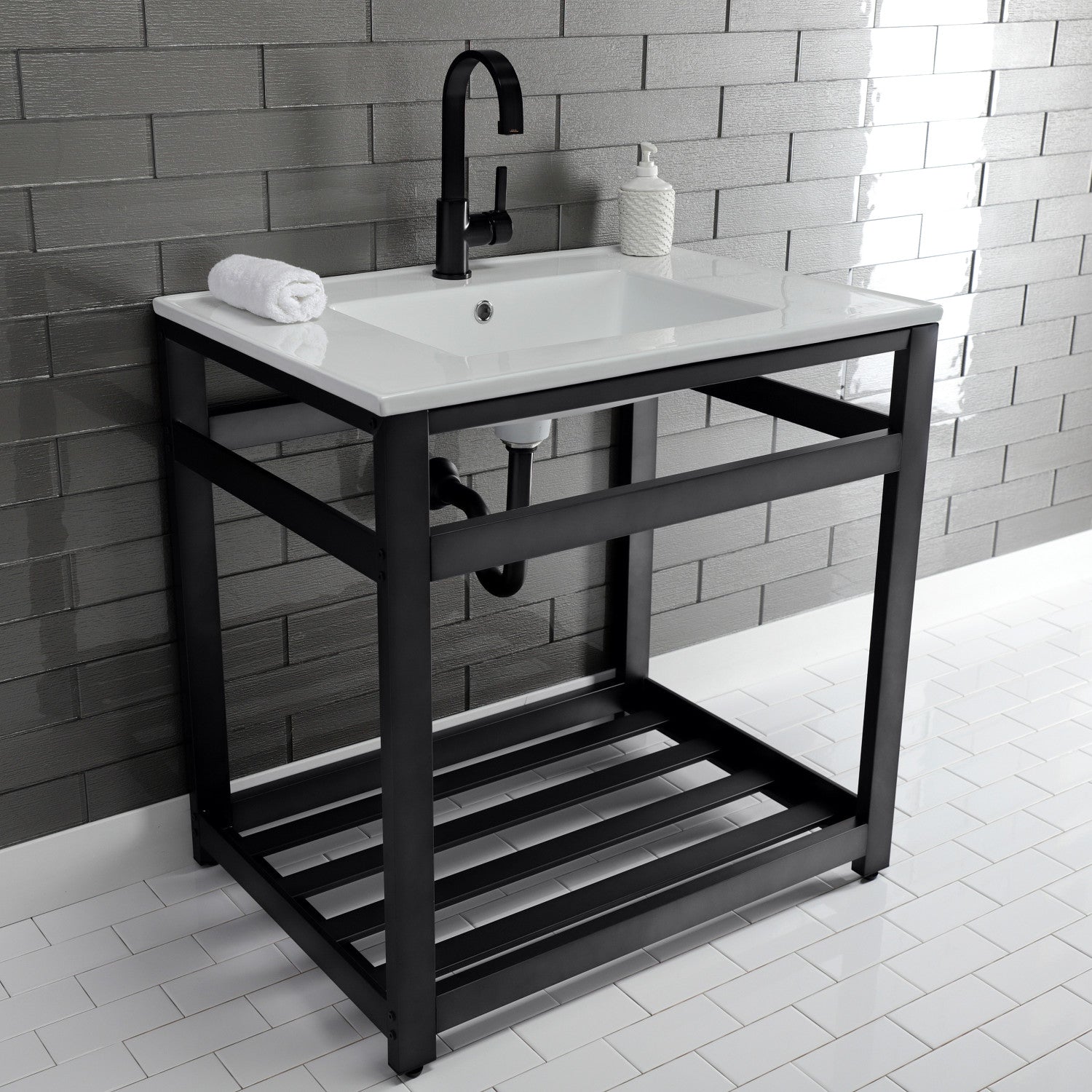 Exquisitely styled for your contemporary taste, this console sink will enhance your bathroom living space. With a beautiful ceramic counter top, this console sink set is a long lasting, durable, and elegant addition to your bathroom. The Kingston Brass 31-inch ceramic console sink (1-hole) features a wash basin and steel base that is available in a handful of finish options. Solid ceramic sinks and tops like the LBT-series top in this listing are finished with a glossy glaze on the top and sink basin interior, making for a pristine, stain-resistant surface and glistening finish that is easily maintained. The underside and basin exterior are unglazed/unfinished and coated with a matte white protective sealant that prevents moisture absorption and staining. Solid ceramic pieces cannot be glazed on all sides, because the nature of ceramic material requires a minimum surface area be left raw during the glaze firing process so the piece does not explode. Water supply kit, drain assembly, and the faucet are sold separately.