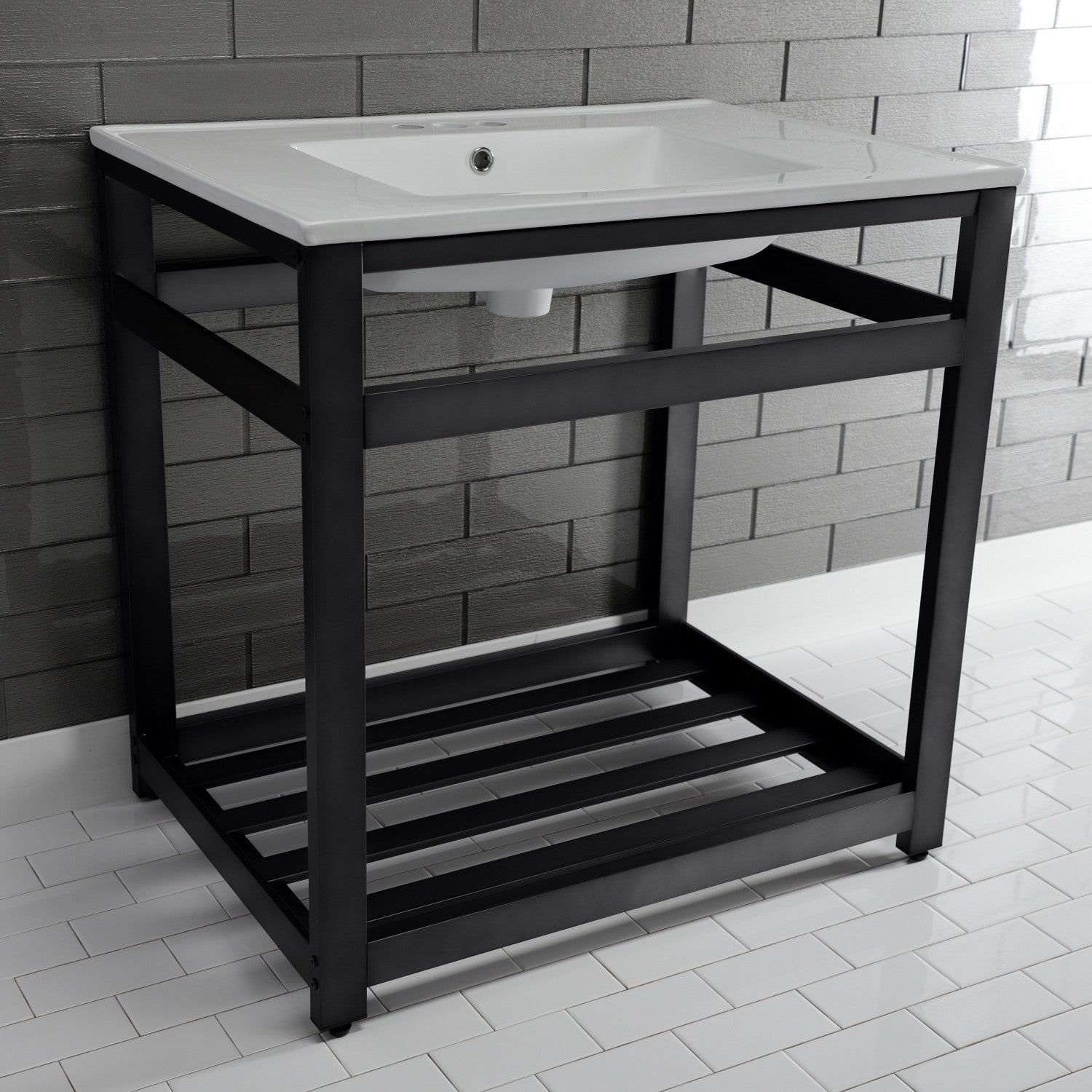 Exquisitely styled for your contemporary taste, this console sink will enhance your bathroom living space. With a beautiful ceramic counter top, this console sink set is a long lasting, durable, and elegant addition to your bathroom. The Kingston Brass 31-inch ceramic console sink (4-inch, 3-hole) features a wash basin and steel base that is available in a handful of finish options. Solid ceramic sinks and tops like the LBT-series top in this listing are finished with a glossy glaze on the top and sink basin interior, making for a pristine, stain-resistant surface and glistening finish that is easily maintained. The underside and basin exterior are unglazed/unfinished and coated with a matte white protective sealant that prevents moisture absorption and staining. Solid ceramic pieces cannot be glazed on all sides, because the nature of ceramic material requires a minimum surface area be left raw during the glaze firing process so the piece does not explode. Water supply kit, drain assembly, and the faucet are sold separately.