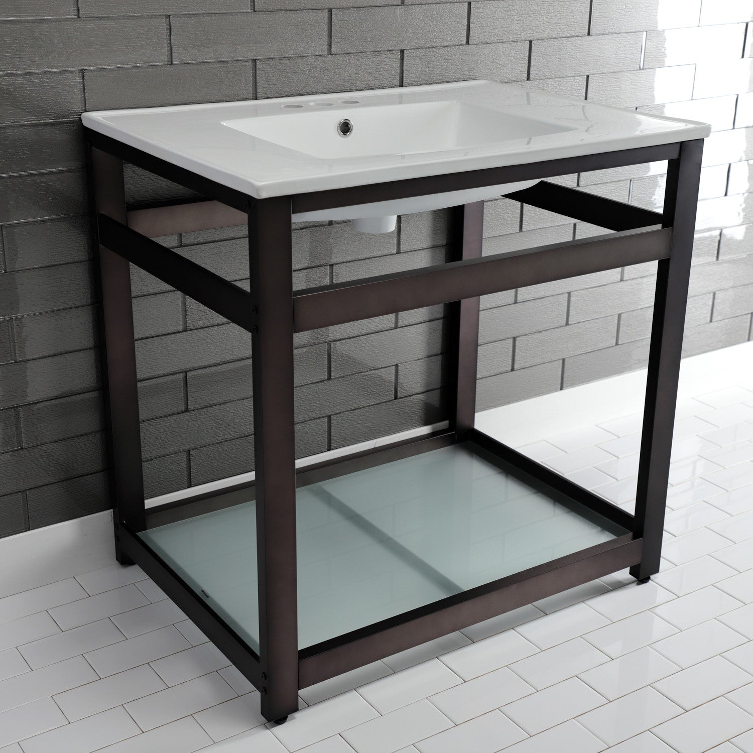 - Includes steel console sink base and tempered glass shelf