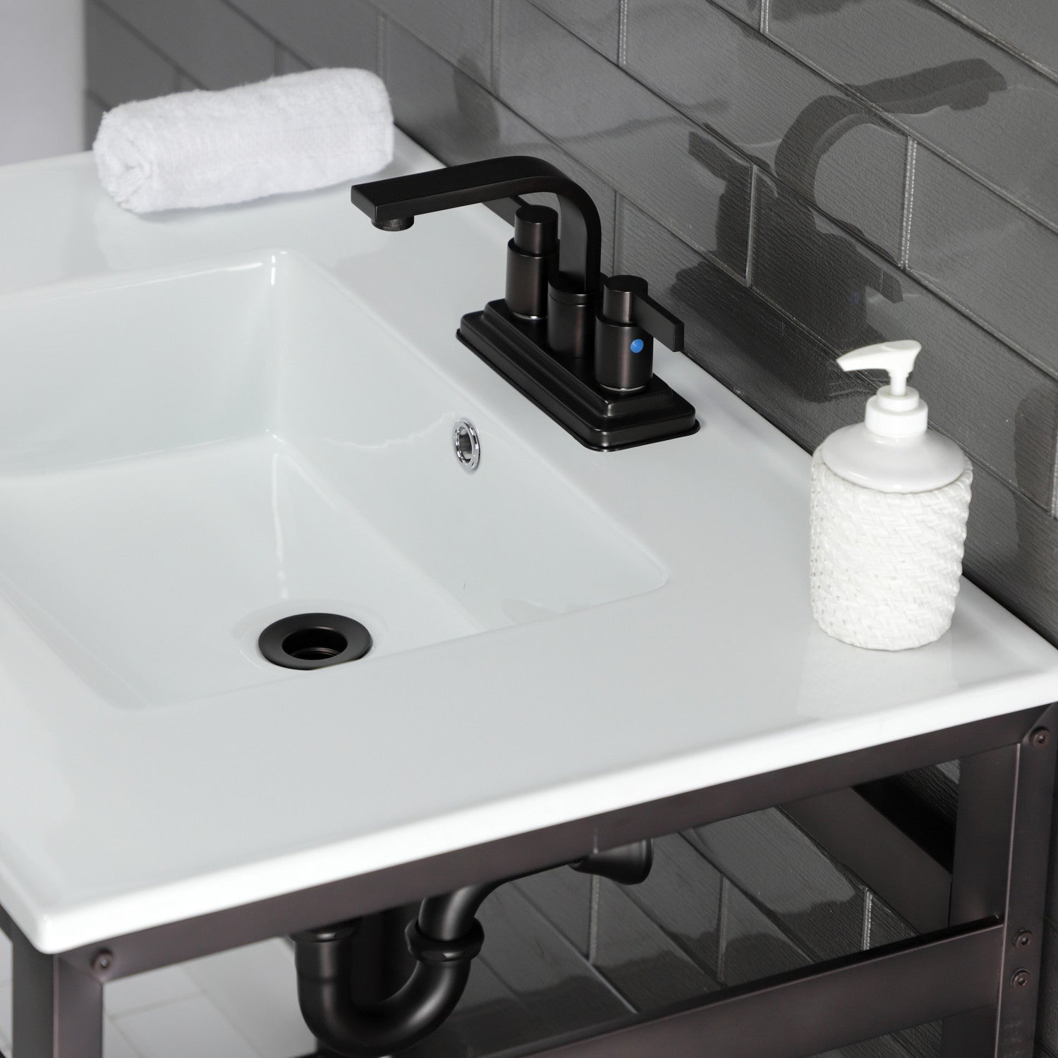Exquisitely styled for your contemporary taste, this console sink will enhance your bathroom living space. With a beautiful ceramic counter top, this console sink set is a long lasting, durable, and elegant addition to your bathroom. The Kingston Brass 31-inch ceramic console sink (4-inch, 3-hole) features a wash basin and steel base that is available in a handful of finish options. Solid ceramic sinks and tops like the LBT-series top in this listing are finished with a glossy glaze on the top and sink basin interior, making for a pristine, stain-resistant surface and glistening finish that is easily maintained. The underside and basin exterior are unglazed/unfinished and coated with a matte white protective sealant that prevents moisture absorption and staining. Solid ceramic pieces cannot be glazed on all sides, because the nature of ceramic material requires a minimum surface area be left raw during the glaze firing process so the piece does not explode. Water supply kit, drain assembly, and the faucet are sold separately.
