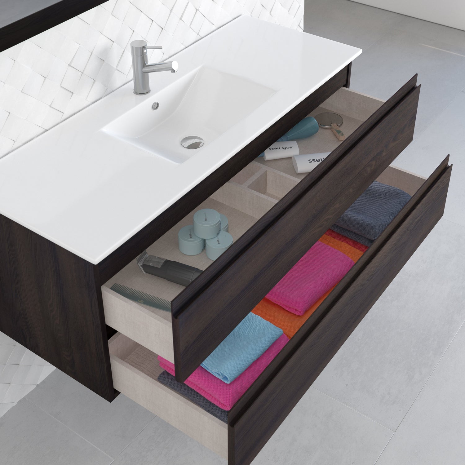 - Features elegant touch with Onix ceramic basin and textured drawer interiors