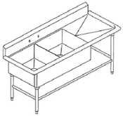 Stainless Steel Two Compartment Sink w/18in.Right Drainboard58.188in. W x 29.5in. D Sink Two 18" wide x 24" fnt-to-bck x 12" dp comp'ts One 18"right drainboard 10"H boxed backsplash w/45 top & 2" return One set of faucet holes 16/304 Stainless Steel 1-5/8" OD galv. legs w/1-1/4" OD adj. side & rear bracing Fully welded front apron & adj. galv. feet Standard 16 Gauge Type 300 stainless steel with # 3 polish, satin finish 12" Deep Bowls All Corners, both vertical and horizontal, coved at 5/8" radius Bottoms of bowls formed for drainage to 3-1/2" diameter die stamped opening Full length 10" High Boxed Backsplash, with 2" return to wall at 45 degree and 3/4" turned down rear lip 1-1/2" Faucet Holes in Backsplash Solid Stainless Steel front panel, type 300 stainless steel with # 3 polish, satin finish All outside corners of assembly are Bullnosed to provide safe,clean and polished edge Standard legs 1-5/8" diameter, 16 gauge galvanized steel 100% pre-galvanized steel - Not Plated Legs located directly under sink bowls, providing increased stability and maximum weight support 2-18X24X12 W/18"DB RIGHT 16GA