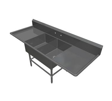 Stainless Steel Two Bowl Bakery Sink w/20in. Double Drainboard103.25in. W x 33.5in. D Bakery Sink Two 20" wide x 28" fnt-to-bck x 12" dp comp'ts Two 30" drnbrds 10"H boxed backsplash w/45 top & 2" return One set offaucet holes 16/304 s/s 1-5/8" OD galv. legs w/1-1/4" OD adj. side & rear bracing Fully welded front apron & adj galv feetStandard 16 Gauge Type 300 stainless steel with # 3 polish, satin finish12" Deep BowlsAll Corners, both vertical and horizontal, coved at 5/8" radiusBottoms of bowls formed for drainage to 3-1/2" diameter die stamped openingFull length 10" H Boxed Backsplash, w/2" return to wall at 45 degree and 3/4" turned down rear lip 20" X 28"1-1/2" Faucet Holes in BacksplashSolid Stainless Steel front panel, type 300 stainless steel with # 3 polish, satin finishAll outside corners of assembly are Bullnosed to provide safe,clean and polished edgeStandard legs 1-5/8" diameter, 16 gauge galvanized steel 100% pre-galvanized steel - Not Plated Legs located directly under sink bowls, providing increased stability and maximum weight support 2-20X28X12 W/30" DB L&R 16GA