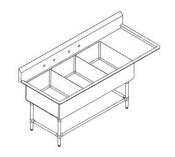 Bakery Sink (3) 20" wide x 28" fnt-to-bck x 12" dp comp'ts (1) 20"R drnbrd 10"H boxed backsplash w/45 top & 2" return (2)sets faucet holes 16/304 s/s 1-5/8" OD galv. legs w/1-1/4" OD adj side & rear bracing Fully welded front apron & adj galv feetFEATURES: * Standard 16 Gauge (optional 14 gauge)Type 300 stainless steel with # 3 polish, satin finish* 12" Deep Bowls (optional 14" deep bowls)* All Corners, both vertical and horizontal, coved at 5/8" radius * Bottoms of bowls formed for drainage to 3-1/2" diameter die stamped opening * Full length 10" High Boxed Backsplash, with 2" return to wall at 45 degree and 3/4" turned down rear lip * 1-1/2" Faucet Holes in Backsplash* Solid Stainless Steel front panel, type 300 stainless steelwith # 3 polish, satin finish* All outside corners of assembly are Bullnosed toprovide safe,clean and polished edge* Standard legs 1-5/8" diameter, 16 gauge galvanized steel100% pre-galvanized steel - Not Plated (optional stainless steel)* Legs located directly under sink bowls, providing increased stability and maximum weight support CONSTRUCTION: Top: Stainless Steel Sinks are TIG welded, Exposed welds are polished to match adjacent surface.Bases: Galvanized Bases are MIG welded MATERIAL: Bowls & 16 gauge stainless Steel (optional 14 Gauge) Top: Type 300 stainless steel with # 3 polish, satin finish Legs: 1 5/8" Round O.D., 16 gauge galvanized steel 100% pre-galvanized steel - Not Plated Bracing: 1 1/4" Round O.D., 16 gauge galvanized steel LEVEL 100% pre-galvanized steel - Not Plated Gussets: Stainless Steel Feet: 1" adjustable galvanized bullet feet 3-20X28X12 W/20" DB RIGHT 16GA