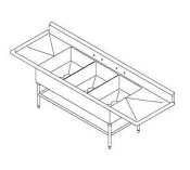 Sink (3) 24" wide x 24" fnt-to-bck x 12" dp comp'ts 10"H boxed backsplash w/45 top & 2" return (2)sets faucet holes 16/304 s/s 1-5/8" OD galv. legs w/1-1/4" OD adj. side & rear bracing Fully welded front apron & adj. galv. feetFEATURES: * Standard 16 Gauge (optional 14 gauge)Type 300 stainless steel with # 3 polish, satin finish* 12" Deep Bowls (optional 14" deep bowls)* All Corners, both vertical and horizontal, coved at 5/8" radius * Bottoms of bowls formed for drainage to 3-1/2" diameter die stamped opening * Full length 10" High Boxed Backsplash, with 2" return to wall at 45 degree and 3/4" turned down rear lip * 1-1/2" Faucet Holes in Backsplash* Solid Stainless Steel front panel, type 300 stainless steelwith # 3 polish, satin finish* All outside corners of assembly are Bullnosed toprovide safe,clean and polished edge* Standard legs 1-5/8" diameter, 16 gauge galvanized steel100% pre-galvanized steel - Not Plated (optional stainless steel)* Legs located directly under sink bowls, providing increased stability and maximum weight support CONSTRUCTION: Top: Stainless Steel Sinks are TIG welded, Exposed welds are polished to match adjacent surface.Bases: Galvanized Bases are MIG welded MATERIAL: Bowls & 16 gauge stainless Steel (optional 14 Gauge) Top: Type 300 stainless steel with # 3 polish, satin finish Legs: 1 5/8" Round O.D., 16 gauge galvanized steel 100% pre-galvanized steel - Not Plated Bracing: 1 1/4" Round O.D., 16 gauge galvanized steel LEVEL 100% pre-galvanized steel - Not Plated Gussets: Stainless Steel Feet: 1" adjustable galvanized bullet feet 3-24X24X12 NO DB 16GA