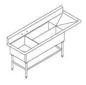 Platter Sink (1) 24" x 24" (2) 31" x 12" x 12" dp comp'ts (1) 24"R drainboard 10"H boxed backsplash w/45 top & 2" return (1)set faucet holes 16/304 s/s 1-5/8" OD galv. legs w/1-1/4" OD adj. side & rear bracing Fully welded front apron & adj galv feetFEATURES: * Standard 16 Gauge (optional 14 gauge)Type 300 stainless steel with # 3 polish, satin finish* 12" Deep Bowls (optional 14" deep bowls)* All Corners, both vertical and horizontal, coved at 5/8" radius * Bottoms of bowls formed for drainage to 3-1/2" diameter die stamped opening * Full length 10" High Boxed Backsplash, with 2" return to wall at 45 degree and 3/4" turned down rear lip * 1-1/2" Faucet Holes in Backsplash* Solid Stainless Steel front panel, type 300 stainless steelwith # 3 polish, satin finish* All outside corners of assembly are Bullnosed toprovide safe,clean and polished edge* Standard legs 1-5/8" diameter, 16 gauge galvanized steel100% pre-galvanized steel - Not Plated (optional stainless steel)* Legs located directly under sink bowls, providing increased stability and maximum weight support CONSTRUCTION: Top: Stainless Steel Sinks are TIG welded, Exposed welds are polished to match adjacent surface.Bases: Galvanized Bases are MIG welded MATERIAL: Bowls & 16 gauge stainless Steel (optional 14 Gauge) Top: Type 300 stainless steel with # 3 polish, satin finish Legs: 1 5/8" Round O.D., 16 gauge galvanized steel 100% pre-galvanized steel - Not Plated Bracing: 1 1/4" Round O.D., 16 gauge galvanized steel LEVEL 100% pre-galvanized steel - Not Plated Gussets: Stainless Steel Feet: 1" adjustable galvanized bullet feet PS 1-24X24/2-32X12X12 24"DB RIGHT