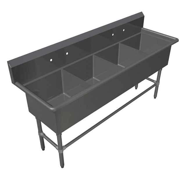 Sink (4) 16" wide x 18" fnt-to-bck x 12" dp comp'ts 10"H boxed backsplash w/45 top & 2" return (2)sets faucet holes 16/304 s/s 1-5/8" OD galv. legs w/1-1/4" OD adj. side & rear bracing Fully welded front apron & adj. galv. feetFEATURES: * Standard 16 Gauge (optional 14 gauge)Type 300 stainless steel with # 3 polish, satin finish* 12" Deep Bowls (optional 14" deep bowls)* All Corners, both vertical and horizontal, coved at 5/8" radius * Bottoms of bowls formed for drainage to 3-1/2" diameter die stamped opening * Full length 10" High Boxed Backsplash, with 2" return to wall at 45 degree and 3/4" turned down rear lip * 1-1/2" Faucet Holes in Backsplash* Solid Stainless Steel front panel, type 300 stainless steelwith # 3 polish, satin finish* All outside corners of assembly are Bullnosed toprovide safe,clean and polished edge* Standard legs 1-5/8" diameter, 16 gauge galvanized steel100% pre-galvanized steel - Not Plated (optional stainless steel)* Legs located directly under sink bowls, providing increased stability and maximum weight support CONSTRUCTION: Top: Stainless Steel Sinks are TIG welded, Exposed welds are polished to match adjacent surface.Bases: Galvanized Bases are MIG welded MATERIAL: Bowls & 16 gauge stainless Steel (optional 14 Gauge) Top: Type 300 stainless steel with # 3 polish, satin finish Legs: 1 5/8" Round O.D., 16 gauge galvanized steel 100% pre-galvanized steel - Not Plated Bracing: 1 1/4" Round O.D., 16 gauge galvanized steel LEVEL 100% pre-galvanized steel - Not Plated Gussets: Stainless Steel Feet: 1" adjustable galvanized bullet feet 4-16X18X12 NO DB 16GA