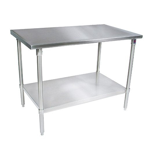 Work Table has 11⁄2" stallion edge on front and rear with straight turndown edge on sides. NSF approved. 16 gauge stainless steel top with adjustable galvanized steel legs and bullet feet. Galvanized undershelf. 120"Wx24"Dx353⁄4"H. 142 lbs. 16GA 120X24 FLAT W/ADJ GALV SHF KD