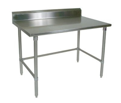 A work table with a 108'' width x 24'' depth by John Boos featuring a 16/300 stainless steel top with 5'' backsplash and turndown, a front stallion safety edge, a 90 degree turndown on sides, stainless steel legs, side and rear adjustable bracing, kd, and is NSF listing. 16GA 108X24 5"BS W/ADJ SS BRC KD