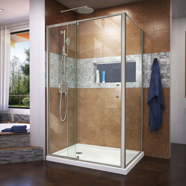 DreamLine Flex 36 in. D x 48 in. W x 74 3/4 in. H Semi-Frameless Shower Enclosure in Brushed Nickel with Left Drain White Base Kit