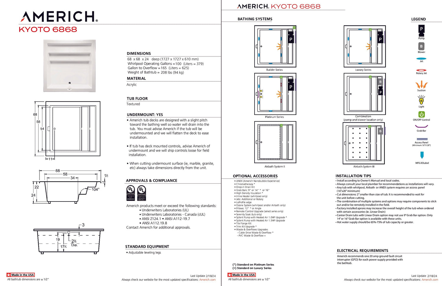 Americh KY6868TA5-BI Kyoto 6868 - Tub Only / Airbath 5 - Biscuit