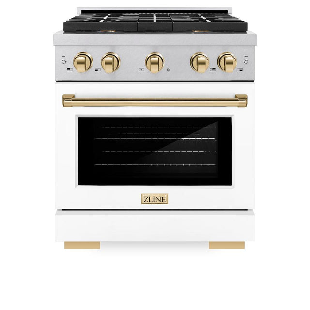 ZLINE Autograph Edition 30 in. 4.2 cu. ft. Paramount Dual Fuel Range with 4 Burner Gas Cooktop and Electric Convection Oven in DuraSnow® Stainless Steel with White Matte Door and Polished Gold Accents (SDRSZ-WM-30-G)