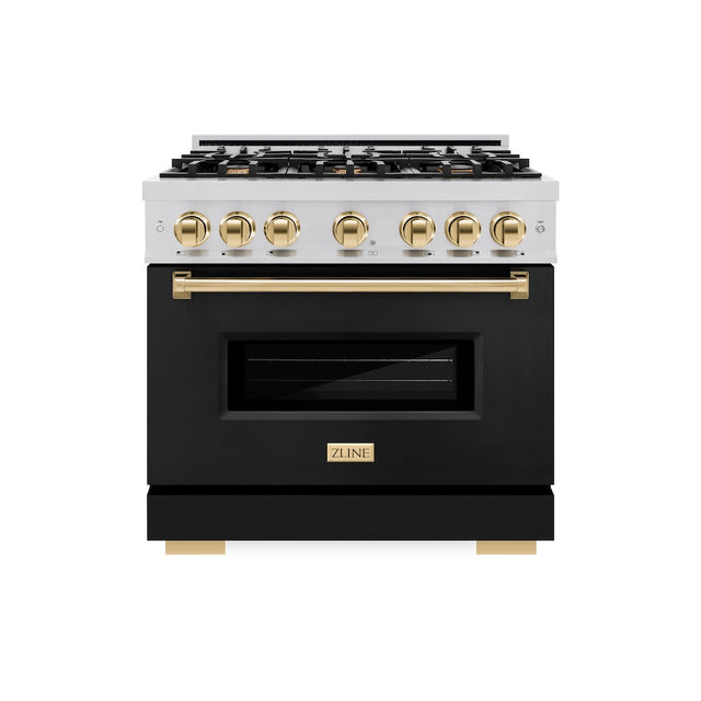 ZLINE Autograph Edition 36 in. 5.2 cu. ft. Classic Dual Fuel Range with 6 Burner Gas Cooktop and Electric Convection Oven in Stainless Steel with Black Matte Door and Polished Gold Accents (CDRZ-BLM-36-G)