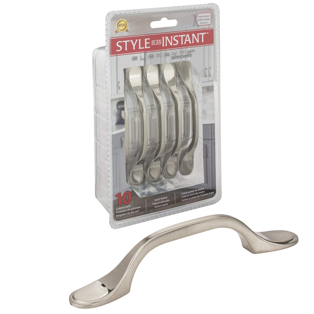 10-Pack of 5" Overall Length Cabinet Pull. Holes are 3" center-to-center. Packaged with twenty 8-32 x 1" screws. Finish: Satin Nickel