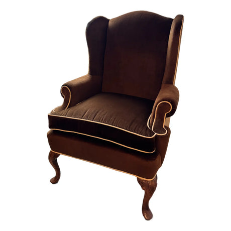 Vintage Ethan Allen Brown Velvet Wingback Chair – Cream Piping & Carved W...