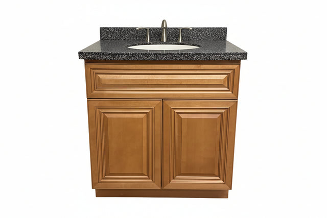 This 30" bathroom vanity combines refined craftsmanship with practical luxury. The solid wood base provides sturdy support and timeless appeal, while the Corian speckled black countertop offers durability and elegant contrast. The Gerber Danze faucet in brushed nickel adds a contemporary touch with its understated sophistication. Soft-close drawers ensure whisper-quiet operation, and the innovative tilt-out design maximizes storage accessibility. An exceptional value for a professionally curated vanity ensemble ready for immediate installation.