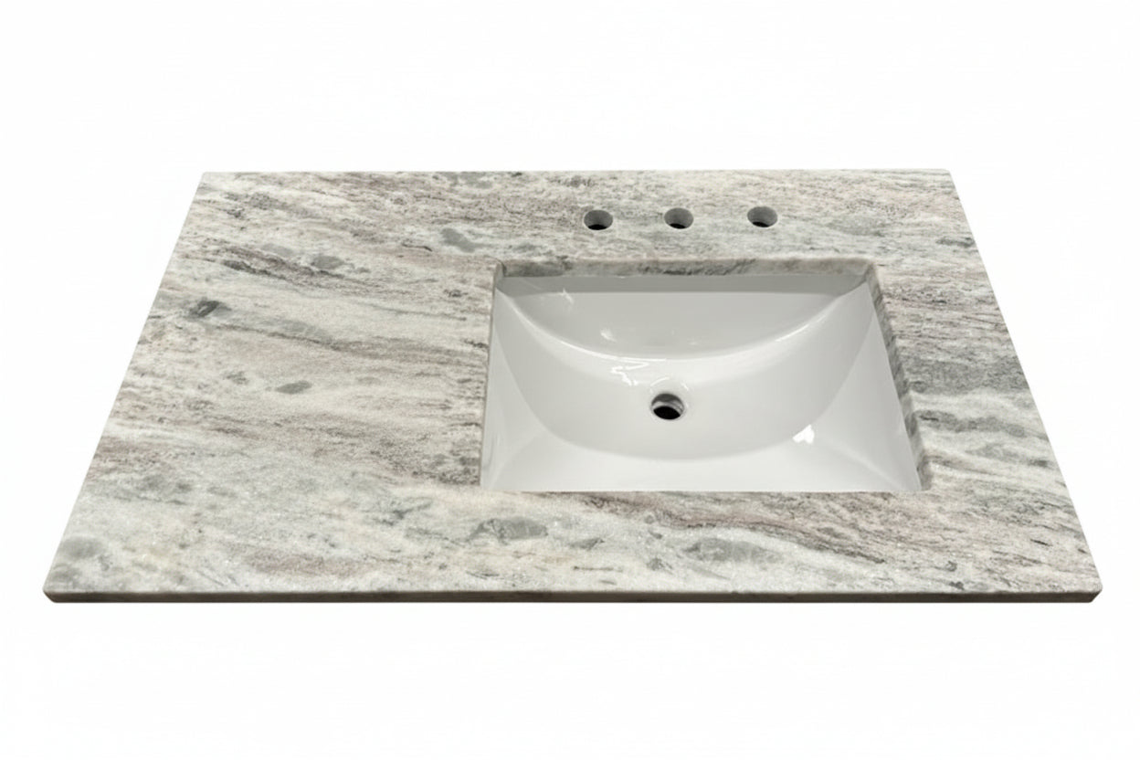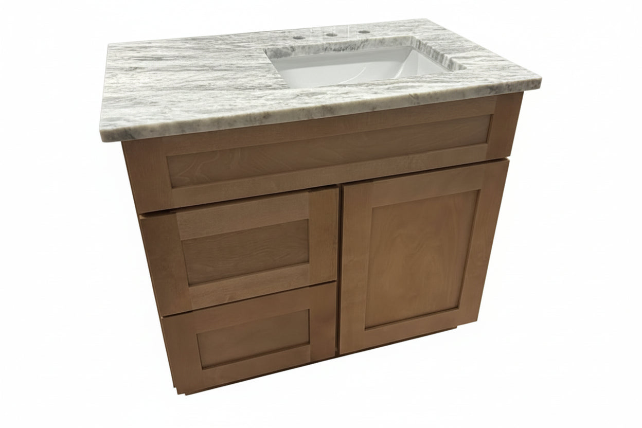 The 36" Cab-Tec Shaker Carmel vanity combines refined craftsmanship with practical luxury. Featuring a substantial 3cm stone countertop and solid wood cabinetry in warm Carmel tones, this piece delivers enduring elegance. The porcelain sink accommodates an 8" widespread faucet setup, while heavy-duty construction ensures years of reliable performance. A 4" backsplash is included to complete the sophisticated aesthetic and protect your walls. An ideal choice for those seeking both style and substance in their bathroom design.