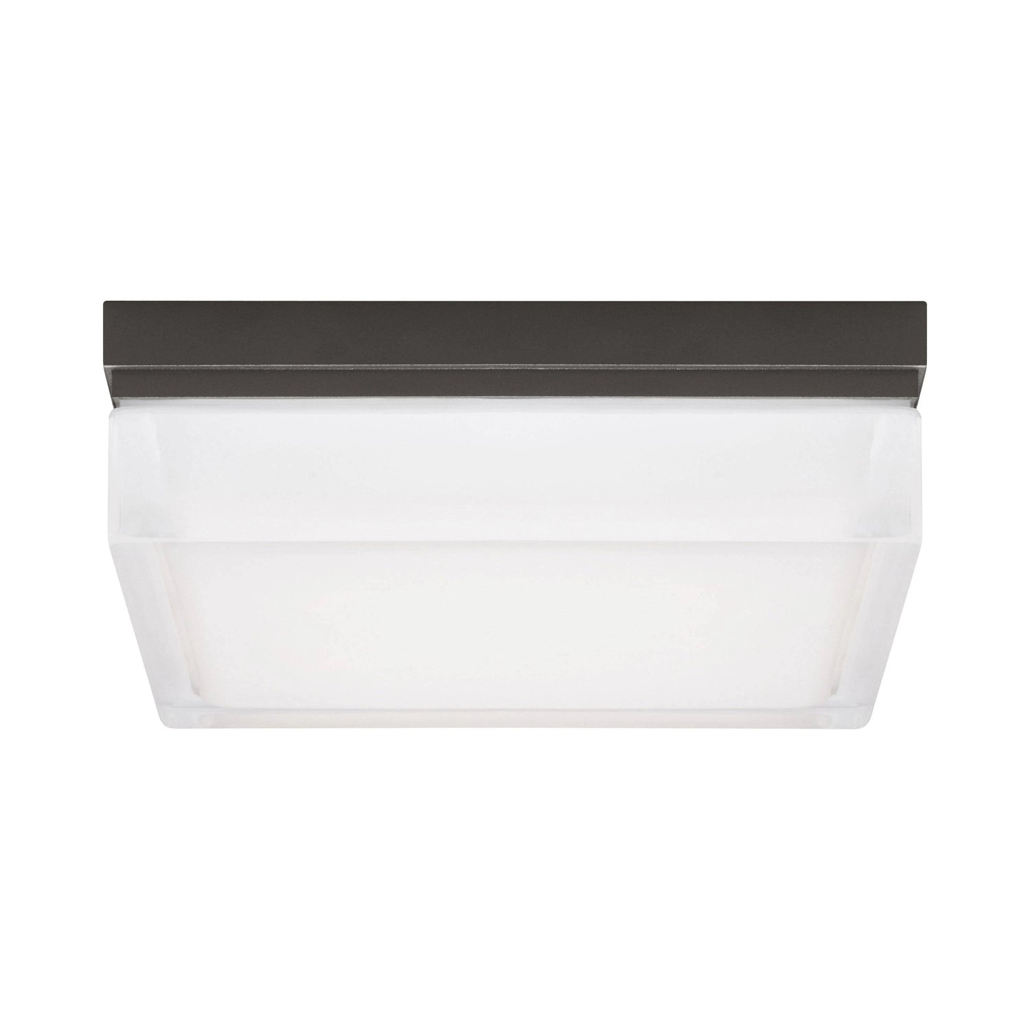Clean square pressed glass shade with polished surface suspended from a die-cast base. May be mounted on the ceiling or wall. Available in three lamp configurations: incandescent, fluorescent, and LED. Large incandescent includes two 120 volt, 40 watt G9 base halogen lamps; Small incandescent includes one 120 volt 40 watt G9 base halogen lamp; Large fluorescent includes two 13 watt 2GX7 base twin tube lamps and electronic ballast; Large LED includes one 15 watt, 800 net lumen, LED module; Small LED includes one 10 watt, 530 net lumen LED module. Incandescent version dimmable with a standard incandescent dimmer (not included). LED version dimmable with low-voltage electronic dimmer (not included). Suitable for wet locations. ADA compliant.