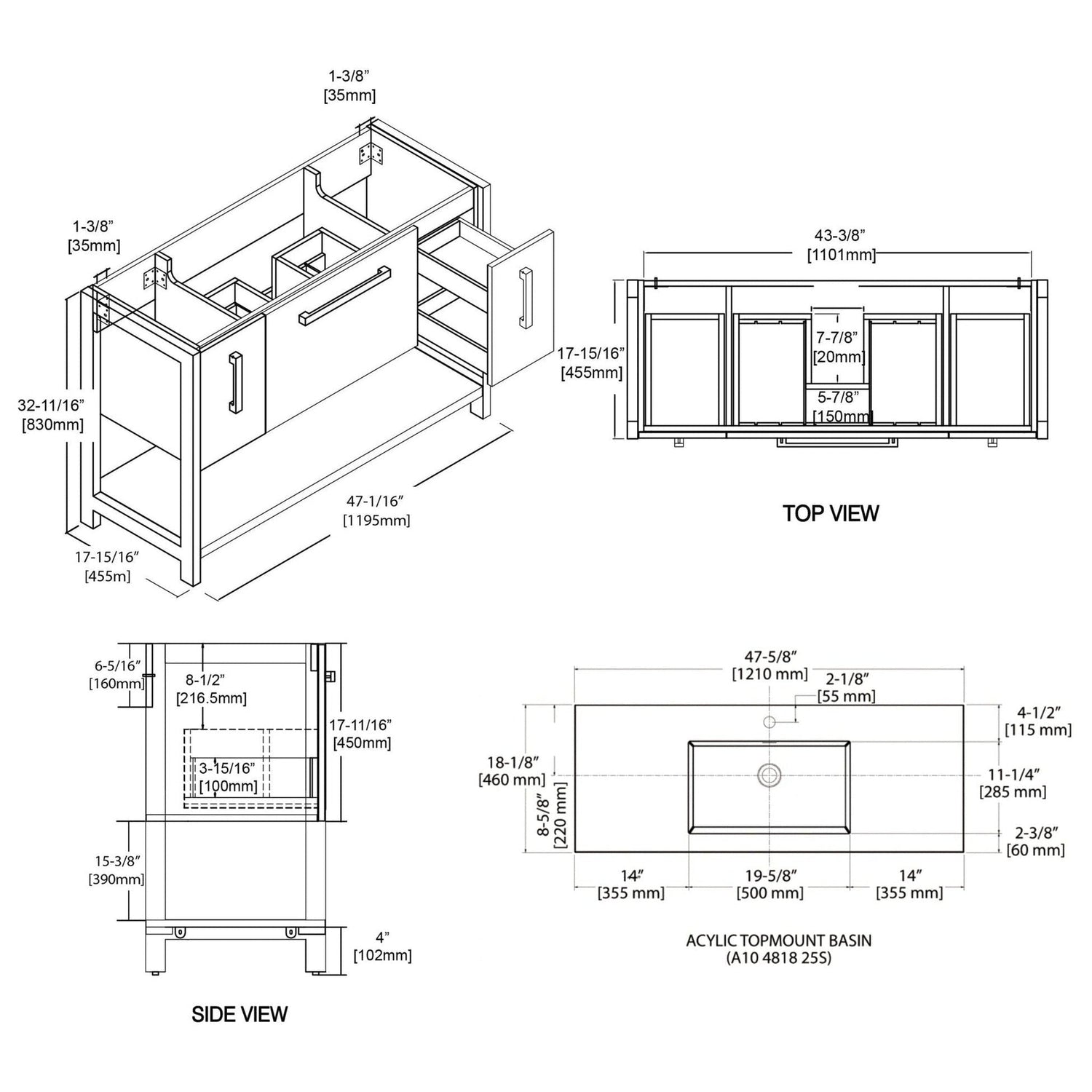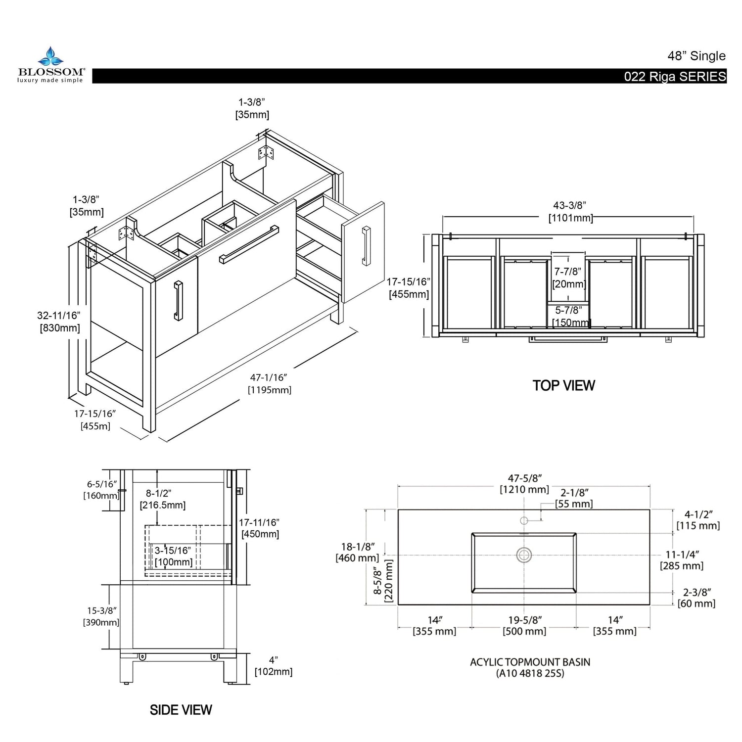 Blossom Riga 48" 3-Drawer Glossy White Freestanding Vanity Set With Acrylic Drop-In Single Sink