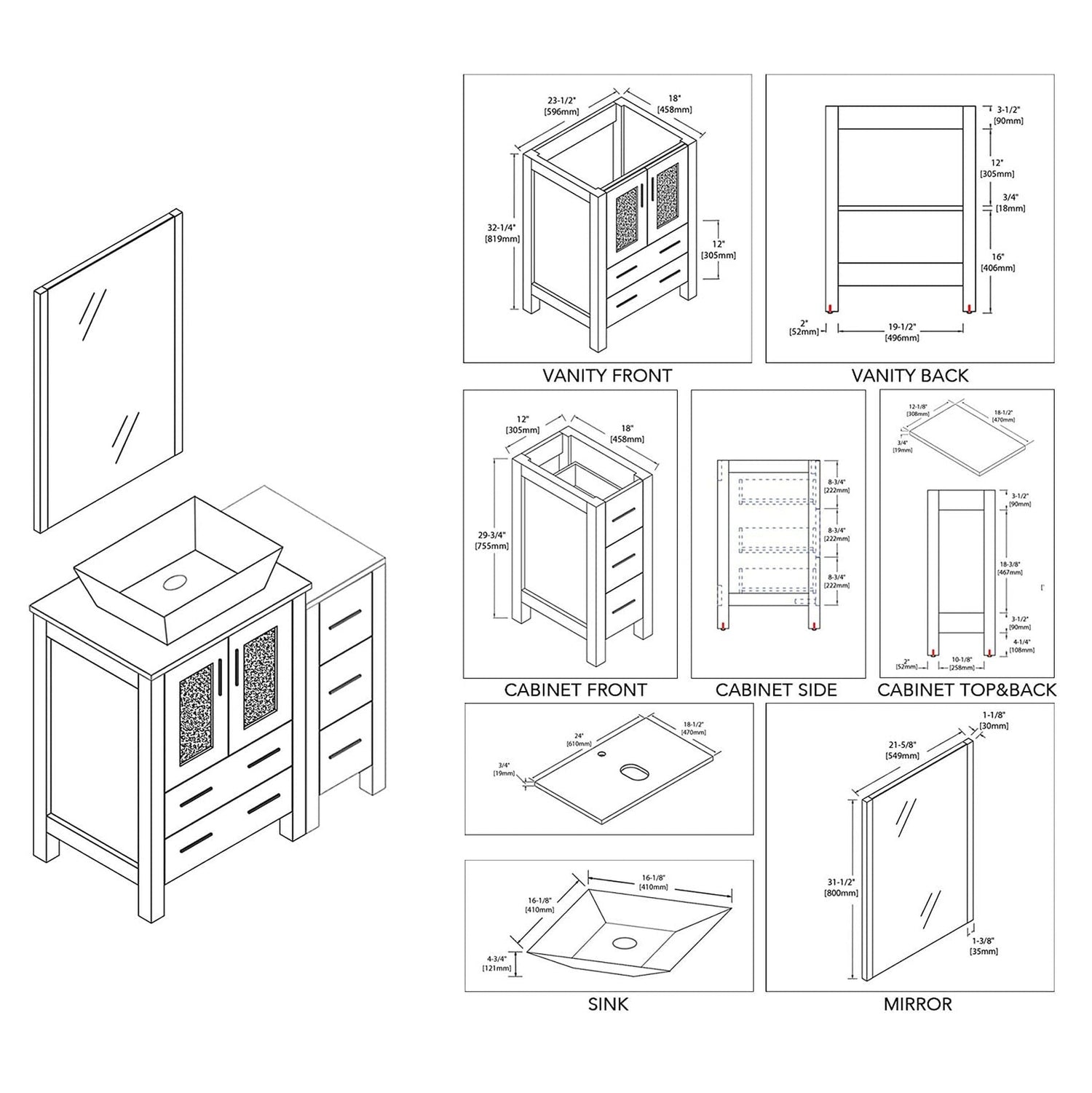 Blossom Sydney 36" Metal Gray Freestanding Vanity Set With Ceramic Vessel Single Sink, Mirror and Side Cabinet