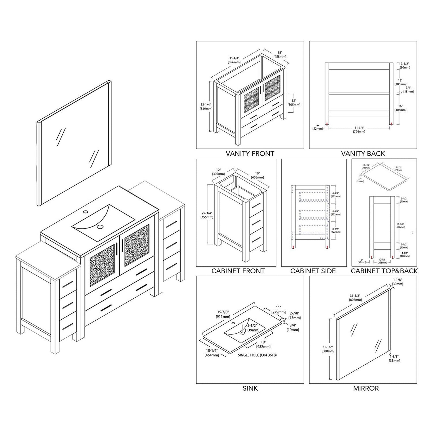 Blossom Sydney 60" White Freestanding Vanity Set With Integrated Double Sink Ceramic Top, Mirror and Two Side Cabinet