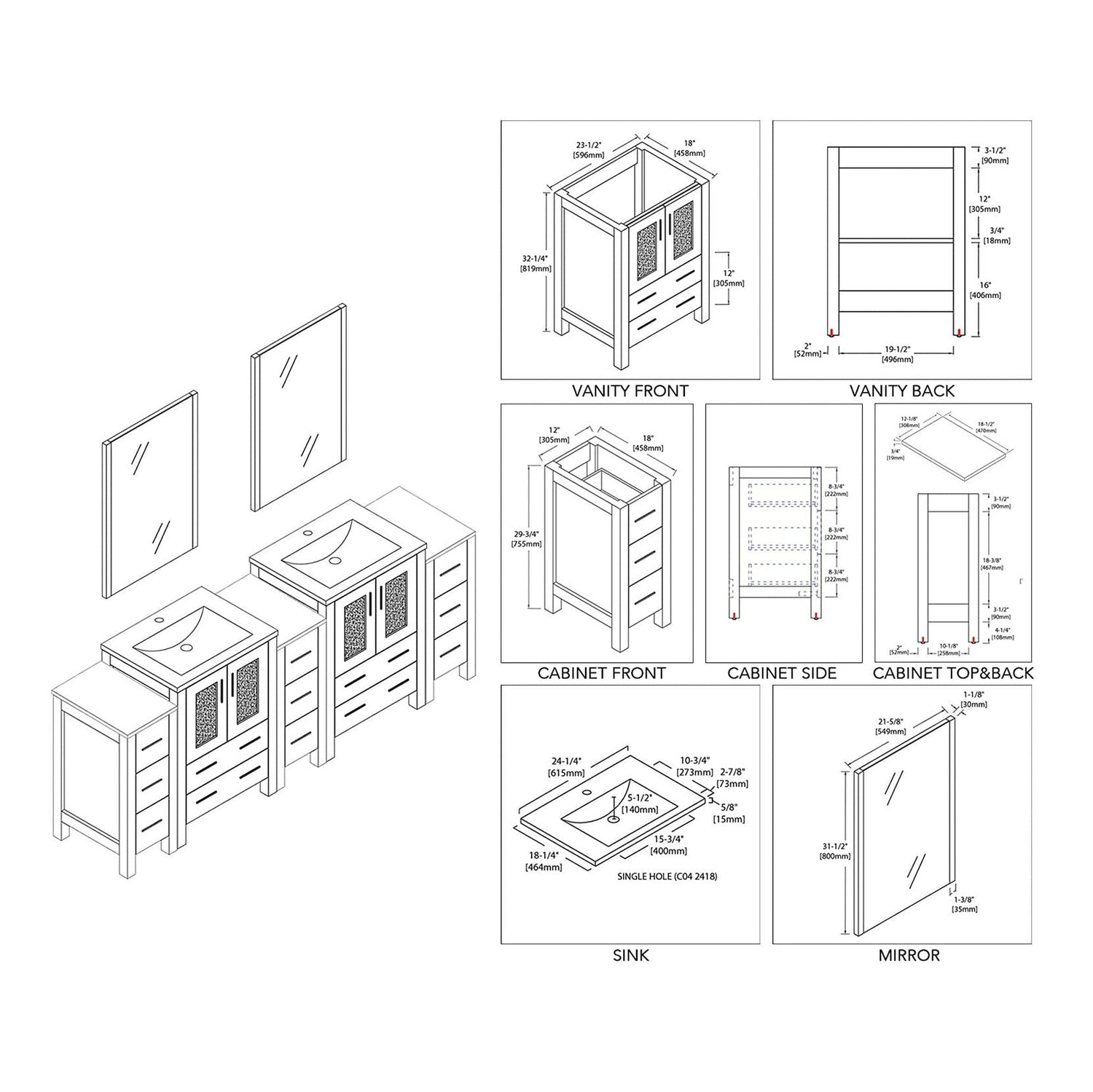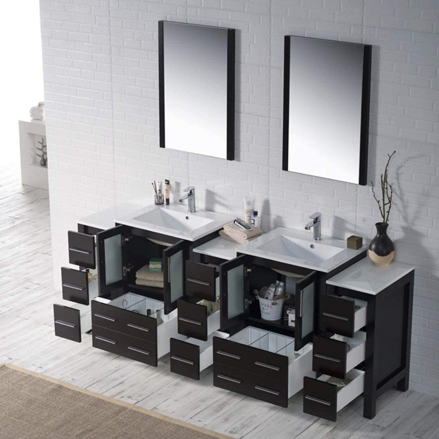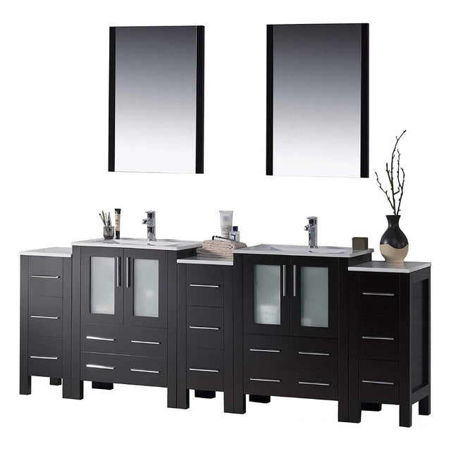 Blossom Sydney 84" Espresso Freestanding Vanity With Ceramic Top, Integrated Double Sinks, Mirror and Three Side Cabinet