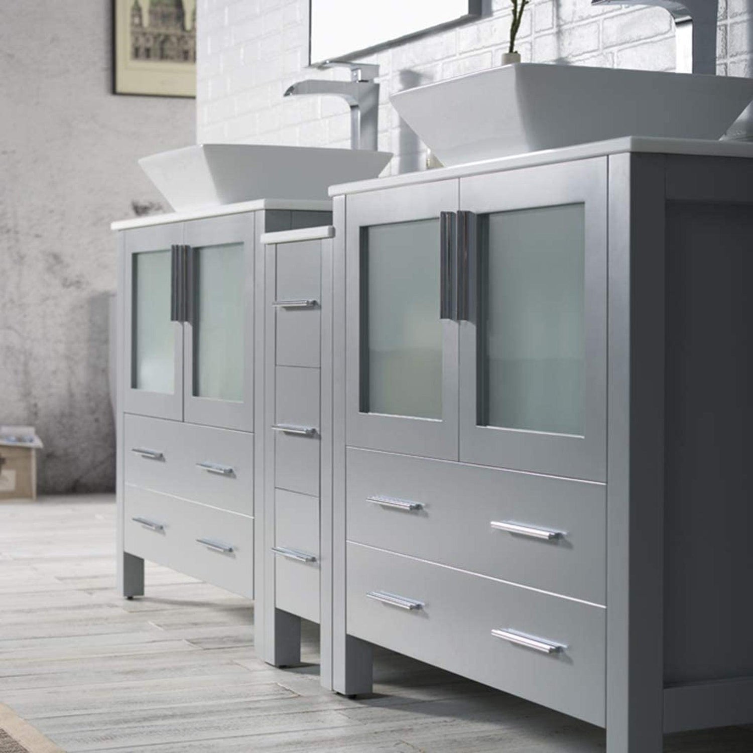 Blossom Sydney 84" Metal Gray Freestanding Vanity Set With Ceramic Double Vessel Sinks and Mirror