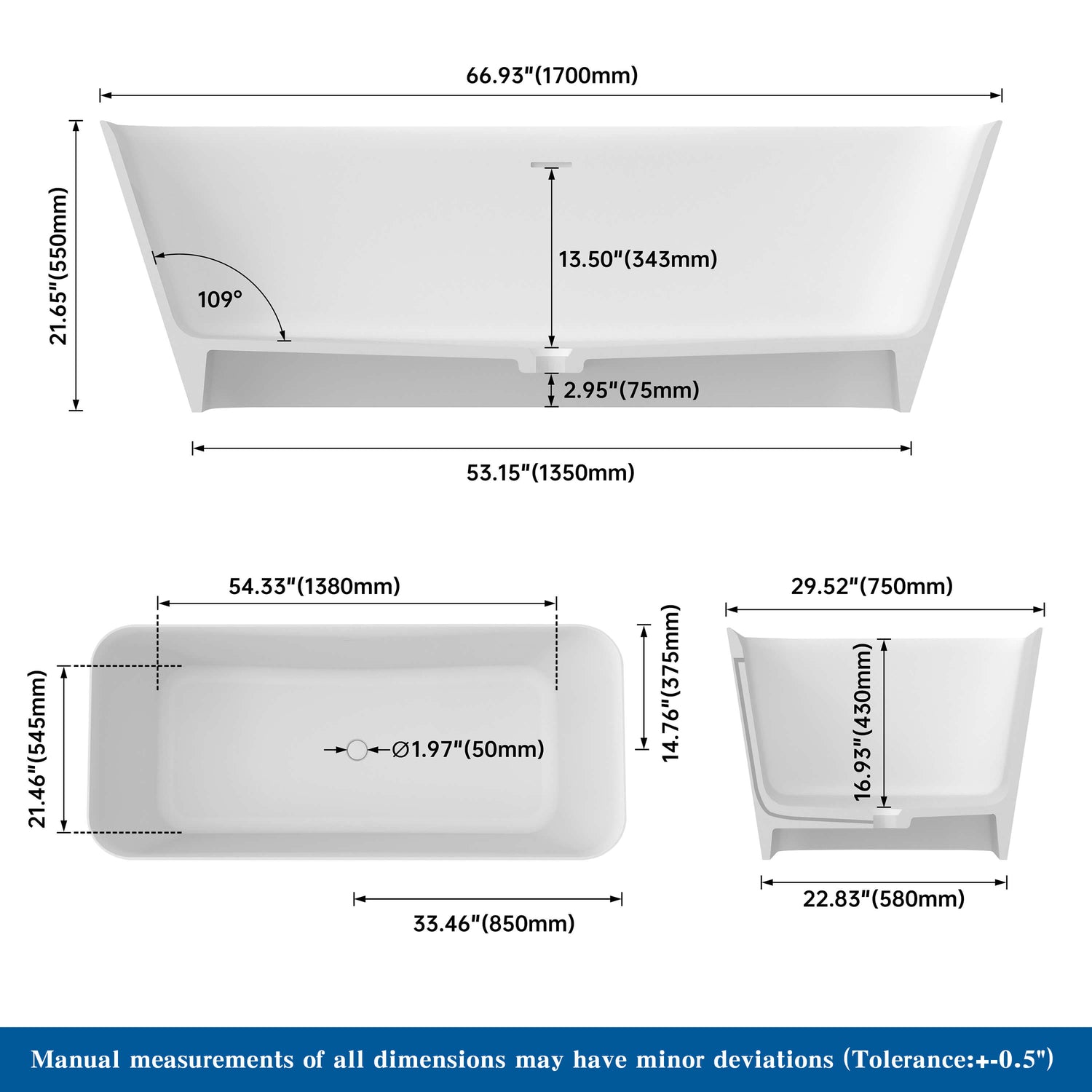 New England Home Goods Broad 67" Freestanding Tub in White - Stone Resin Solid Surface