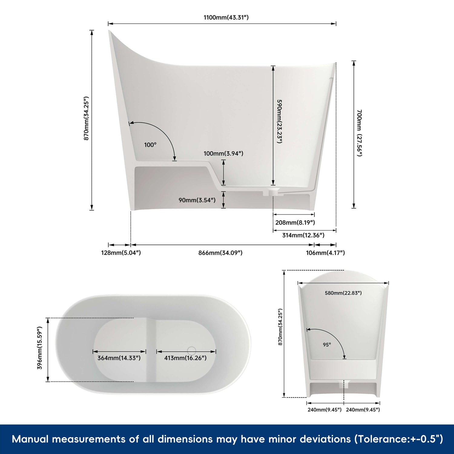 New England Home Goods Kosciuszko 43" Freestanding Tub in White - Stone Resin Solid Surface