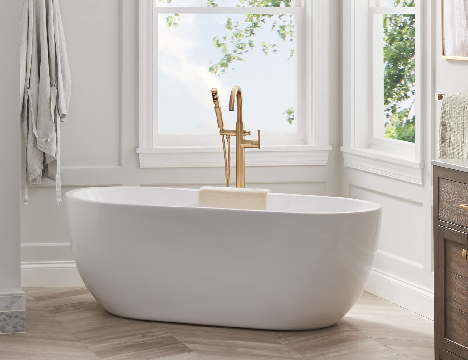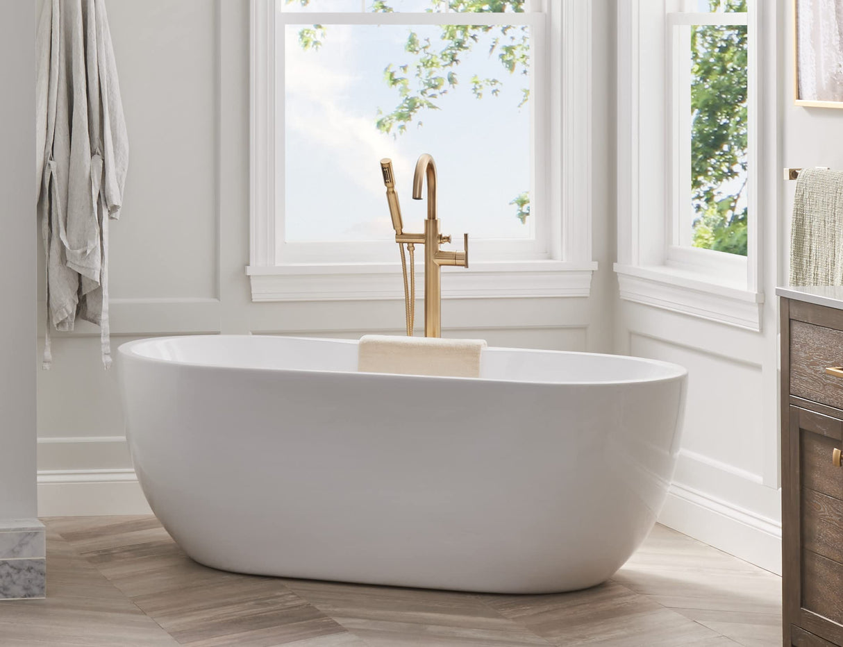 Gerber Plumbing has been manufacturing home improvement plumbing tools from shower heads to faucets to china fixtures since 2001. Not only providing necessities, the products include a variety of decorative faucets and bath accessories. Designed with comfort, durability and style in mind, there is no question that this should be your choice when it comes to modern plumbing. Product Information Product Overview Flow Rate: 1.75 gpm Max Flow @ 80 psi Installation: 1-Hole InstallationBrand: Gerber Features 1.75 gpm Maximum Flow Rate @ 90 psi Cartridge Type: Includes Ceramic Disc Pressure Balance CartridgeEasy Clean Nozzles: Features Easy Clean Soft-Touch NozzlesIntegral Check Valve: Includes integral check valve for backflow preventionWarranty: Limited lifetime Description Stately in stature and elegantly crafted the Contemporary Floor Mount Tub Filler brings your bathroom decor dreams to life. The high-arc spout is offset by the delicate handle style for an overall distinctive allure. A handshower with flexible 59 metal shower hose provides rinsing flexibility when bathing. This tub filler is designed coordinate with a variety of modern Gerber faucet styles to complete your dream bathroom. Components Includes: Single-Function HandshowerSold Separately Required: Required: Rough-in valve for floor mount tub filler D315000bt