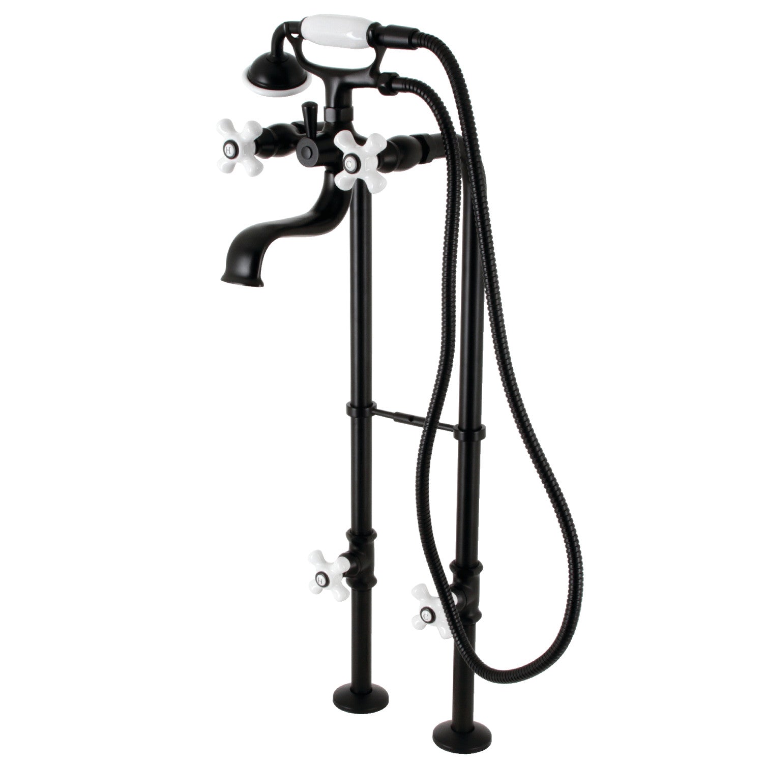 Distinguished for its elegance, sophistication, and exquisite architecture, this freestanding tub faucet is the perfect fixture for any traditional home. Allow it to both complement your freestanding tub and act as a beautiful ornamental piece in your bathroom. As the perfect accompaniment to your tub, the Kingston freestanding clawfoot tub faucet with supply lines will surely complete your refined bathroom decorum with the help of its premium, glistening matte black finish and hand shower. The solid brass construction also makes for a heavy, quality made product. Hand shower with porcelain handle and 59-inch hose.