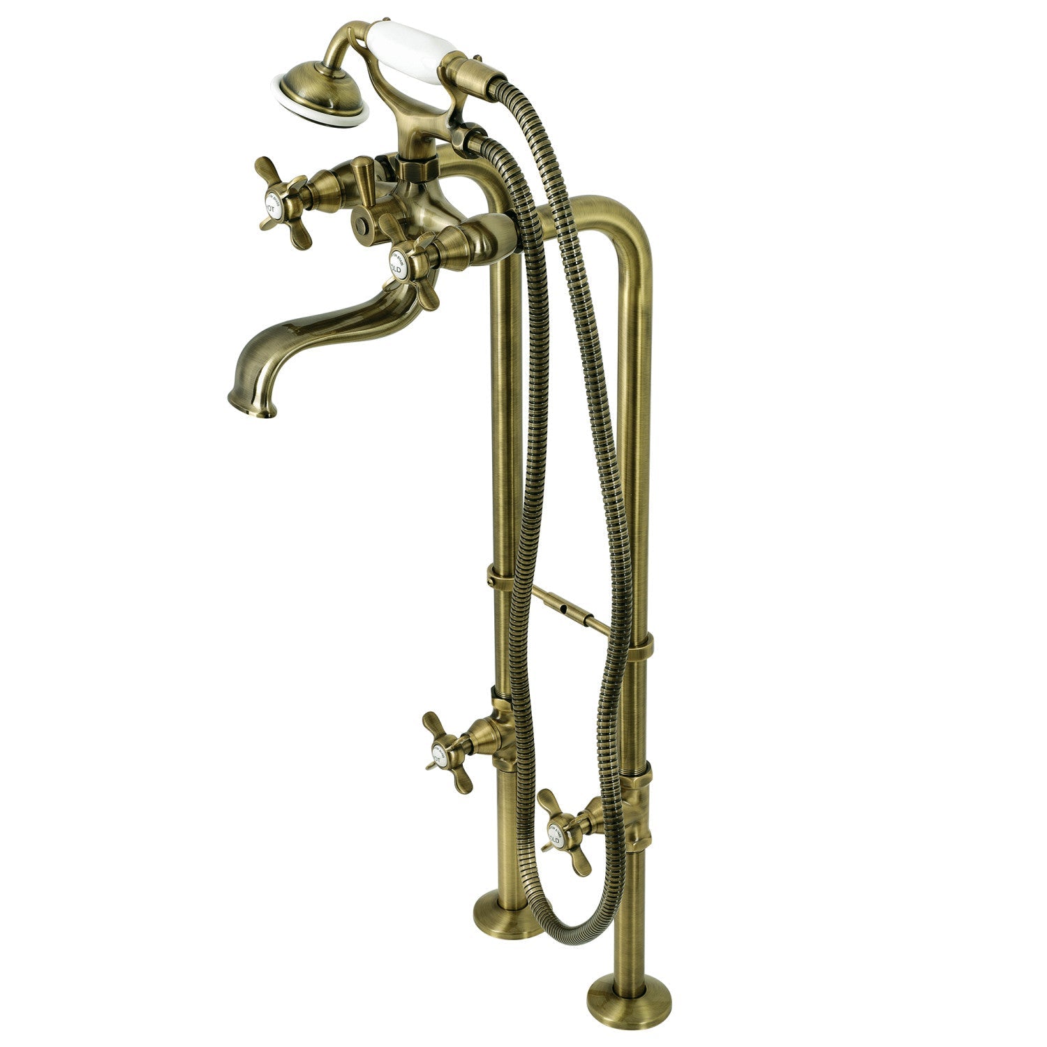 Distinguished for its elegance, sophistication, and exquisite architecture, this freestanding tub faucet is the perfect fixture for any traditional home. Allow it to both complement your freestanding tub and act as a beautiful ornamental piece in your bathroom. As the perfect accompaniment to your tub, the Essex freestanding clawfoot tub faucet with water supply lines and valves will surely complete your refined bathroom decorum with the help of its premium, glistening antique brass finish and hand shower. The solid brass construction also makes for a heavy, quality made product. Includes hand shower with porcelain handle and 59-inch hose.