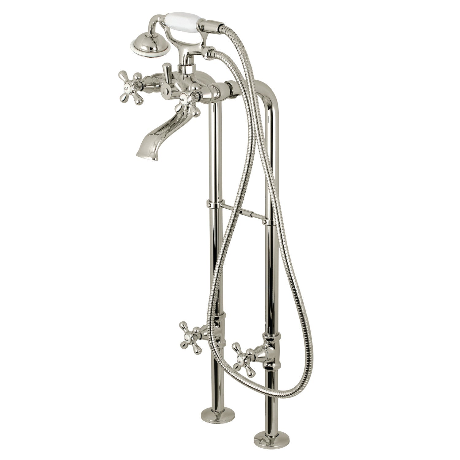 Distinguished for its elegance, sophistication, and exquisite architecture, this freestanding tub faucet is the perfect fixture for any traditional home. Allow it to both complement your freestanding tub and act as a beautiful ornamental piece in your bathroom. As the perfect accompaniment to your tub, the Kingston Freestanding Tub Faucet with Supply Line and Stop Valve will surely complete your refined bathroom decorum with the help of its premium, glistening polished nickel finish and hand shower. The solid brass construction also makes for a heavy, quality made product.