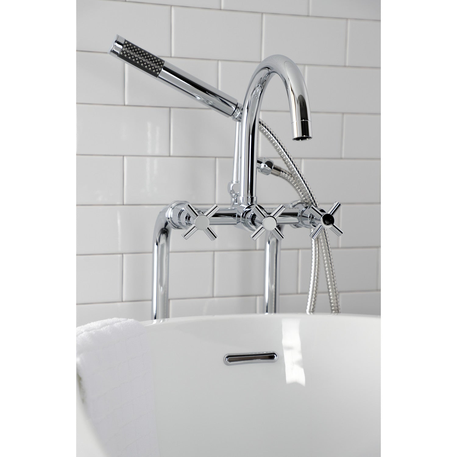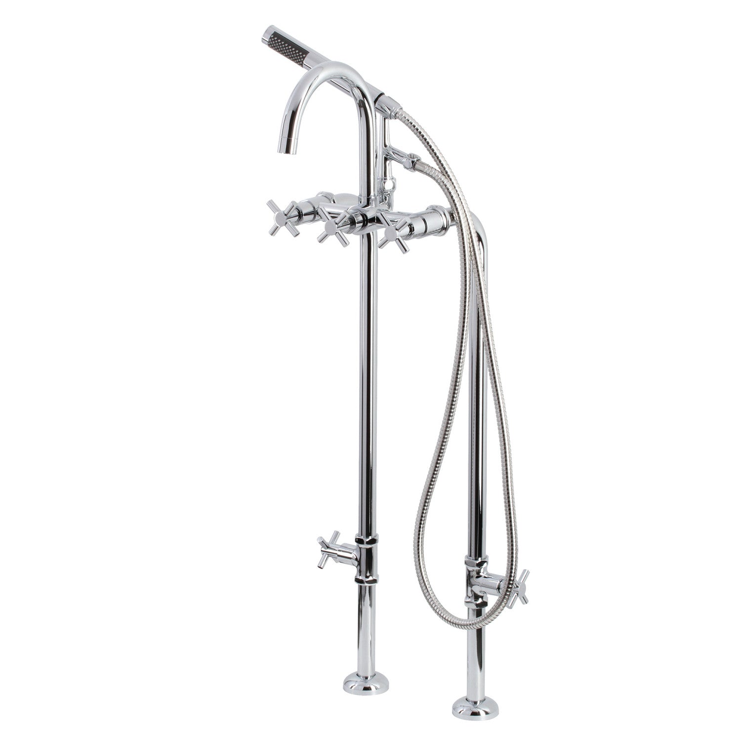 Distinguished for their stately configuration and artsy architecture, freestanding tub faucets are the perfect fixture for any contemporary home to both complement a freestanding tub and act as a beautiful ornamental piece in your bathroom. As the perfect accompaniment to your tub, the Concord freestanding tub faucet will surely complete your refined bathroom decorum with the help of its premium, glistening polished chrome finish and hand shower. The solid brass construction also makes for a heavy, quality made product. Includes hand shower, water supply lines and shut off valves.