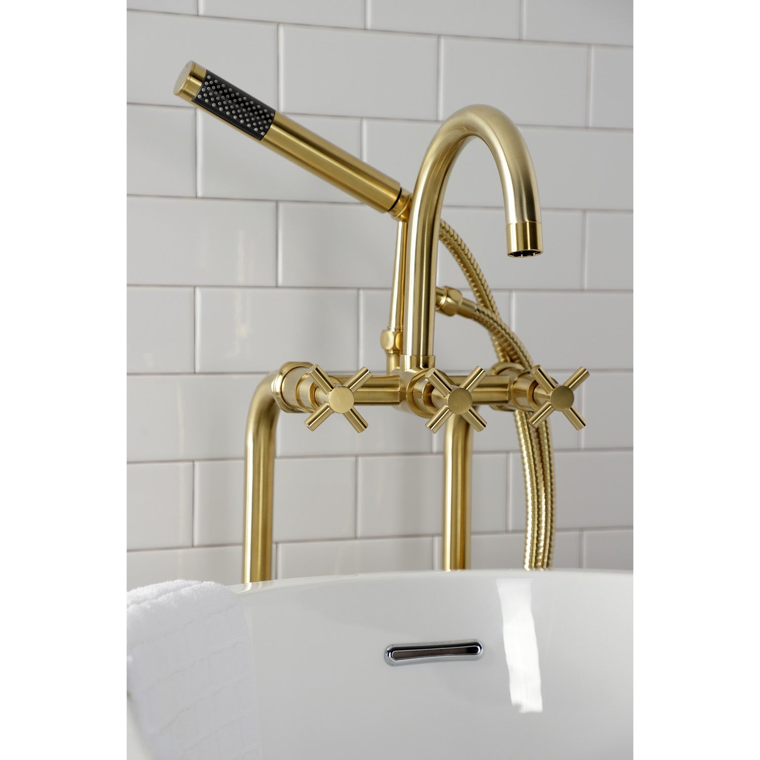 Distinguished for their stately configuration and artsy architecture, freestanding tub faucets are the perfect fixture for any contemporary home to both complement a freestanding tub and act as a beautiful ornamental piece in your bathroom. As the perfect accompaniment to your tub, the Concord freestanding tub faucet will surely complete your refined bathroom decorum with the help of its premium, glistening brushed brass finish and hand shower. The solid brass construction also makes for a heavy, quality made product. Includes hand shower, water supply lines and shut off valves.